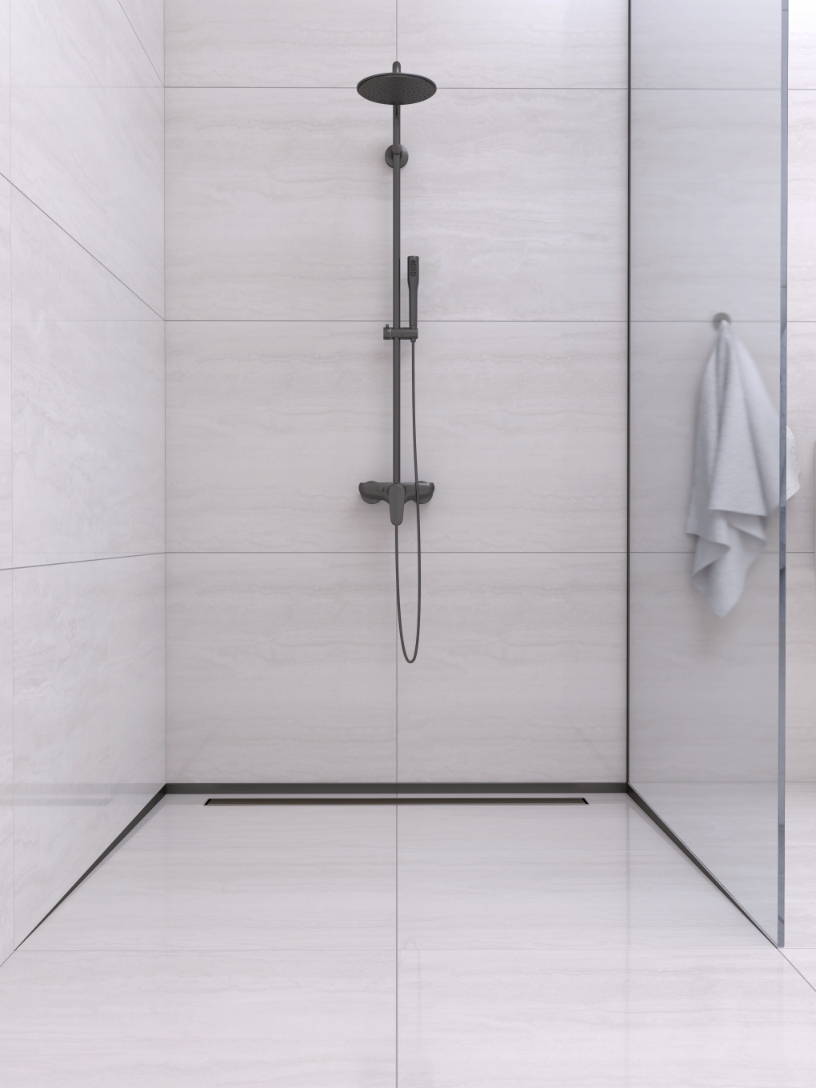 - Нахил для лінійного водостоку є естетичним оздобленням душової кабіни та додає елегантності всьому інтер’єру. li>