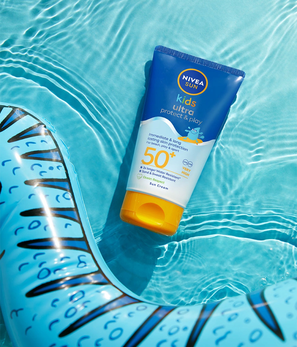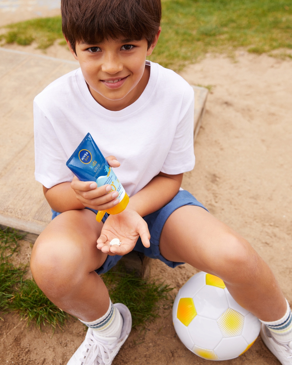 Для надзвичайно активної дитини, яка любить проводити час на свіжому повітрі, виберіть високоефективний захист від сонця. Лосьйон для засмаги для дітей NIVEA SUN Kids Ultra Protect & Play створений спеціально для потреб ніжної шкіри дітей старше 3 років. Дбайлива формула сонцезахисного крему для дітей забезпечує високий захист від сонця завдяки системі фільтрів UVA/UVB SPF 50+, а також у 3 рази стійкіша до води, поту та піску*. Зміцнює захисний бар’єр шкіри та дозволяє довше та безпечніше розважатися у воді.