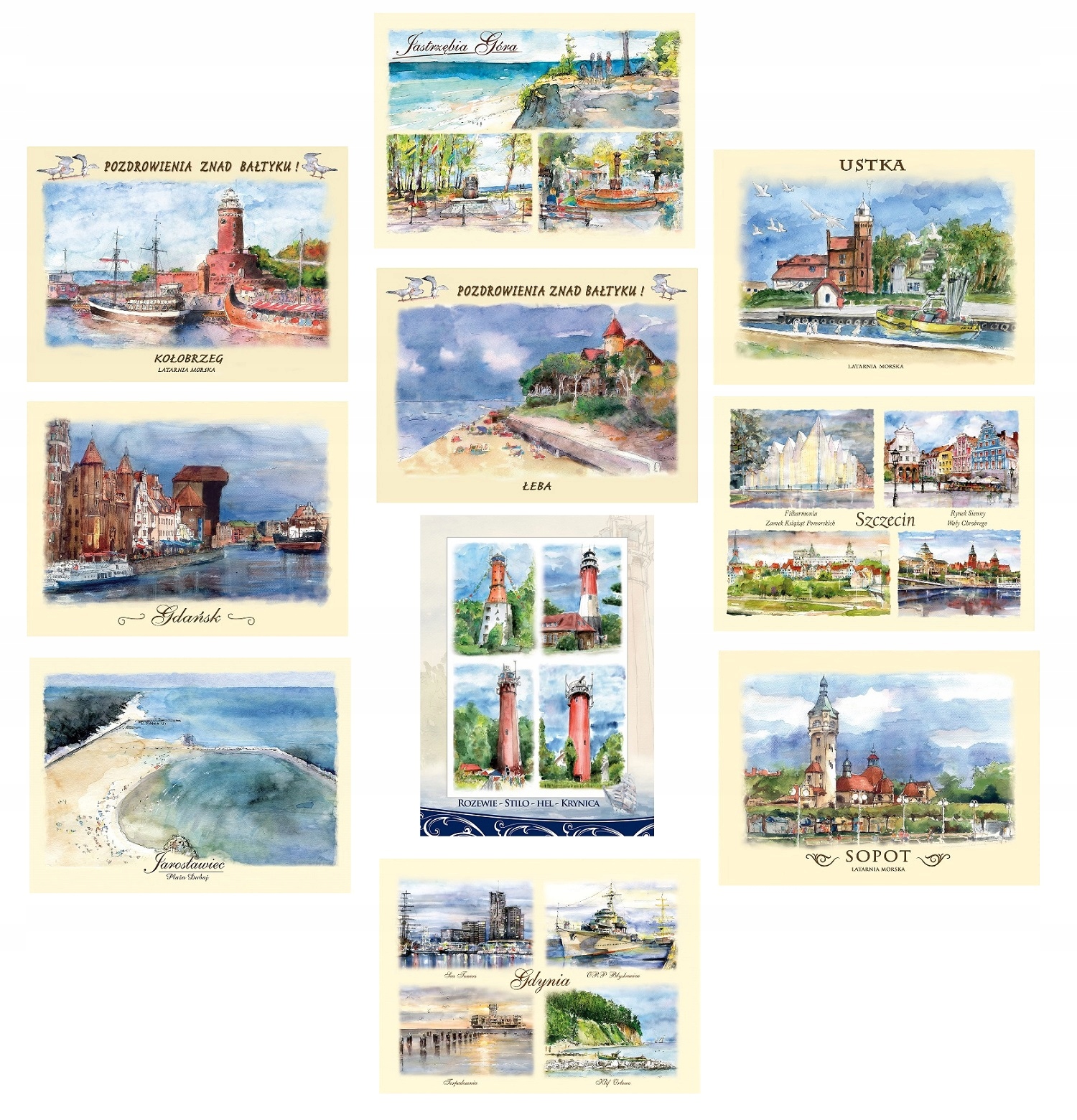 Набір листівок із видами міст та селищ на Балтійському морі в акварелі - як на картинці - Гданськ, Гдиня, Сопот, Колобжег, Ярославець, Ястшембя Góra, Łeba, Ustka , Hel, Stilo, Rozewie, Krynica, Szczecin