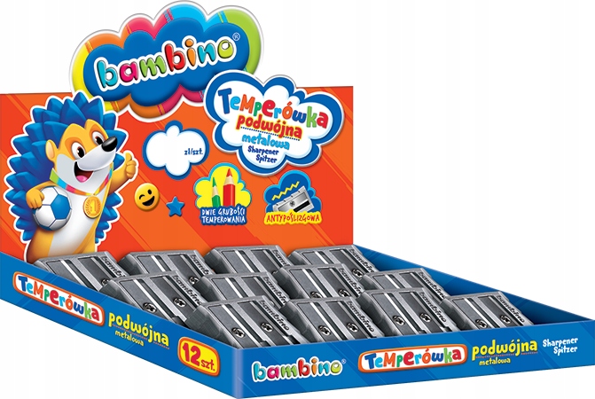 Характерна продукція бренду Bambino — чудова творча розвага для кожної дитини. Відома поколінням точилка відмінно підійде для маленьких шедеврів. Має два отвори для заточування олівців і кольорових олівців, також великого розміру. Проста ергономічна форма ідеально підходить для маленької руки дітей і дорослих. Алюмінієва точилка міцна та надійна.