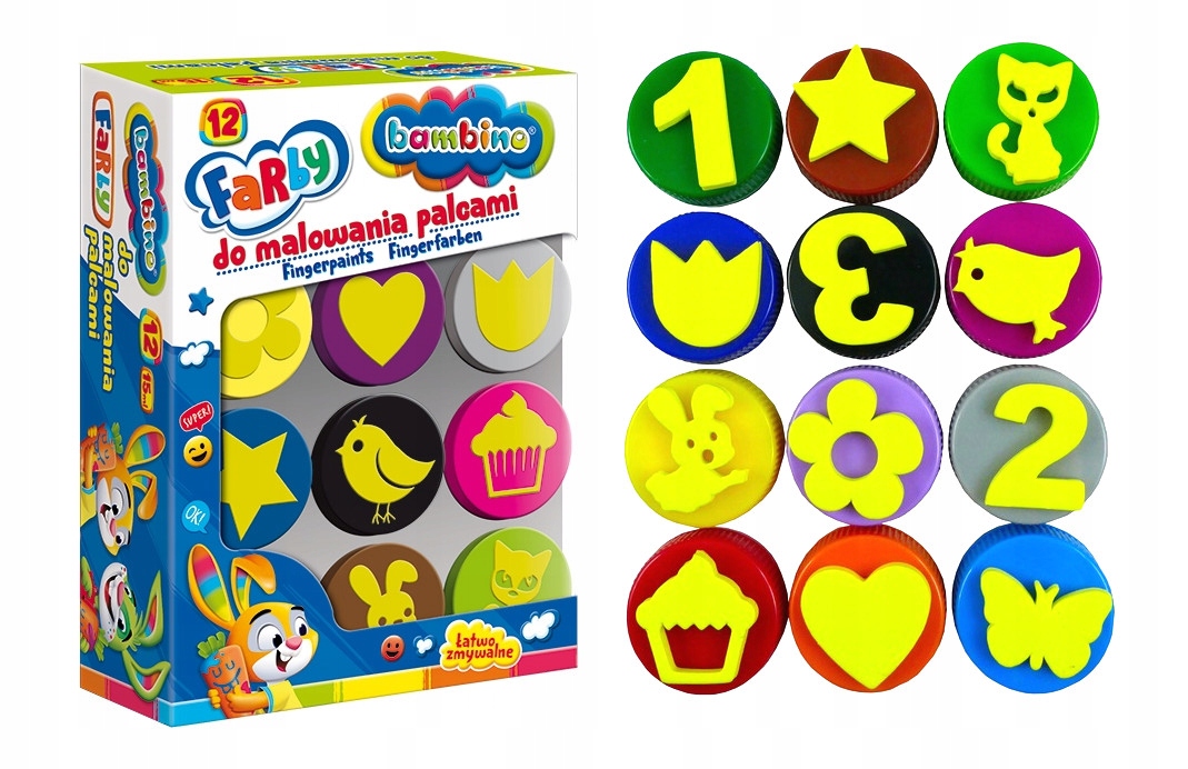 Пальчикові фарби BAMBINO нешкідливі та легко миються. Можна використовувати без води. Вони відмінно розтікаються по паперу, картону або картону. В упаковці 12 інтенсивних кольорів.