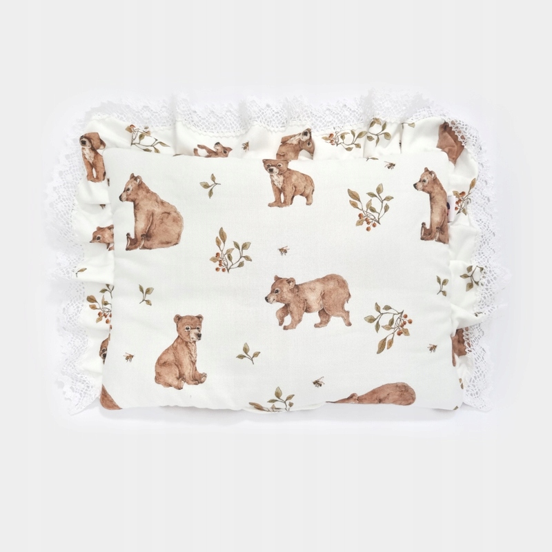 - Подушка, оброблена з 3 сторін рюшами та мереживом, обтягнута бамбуковою тканиною 25×35 см (+/-3см).