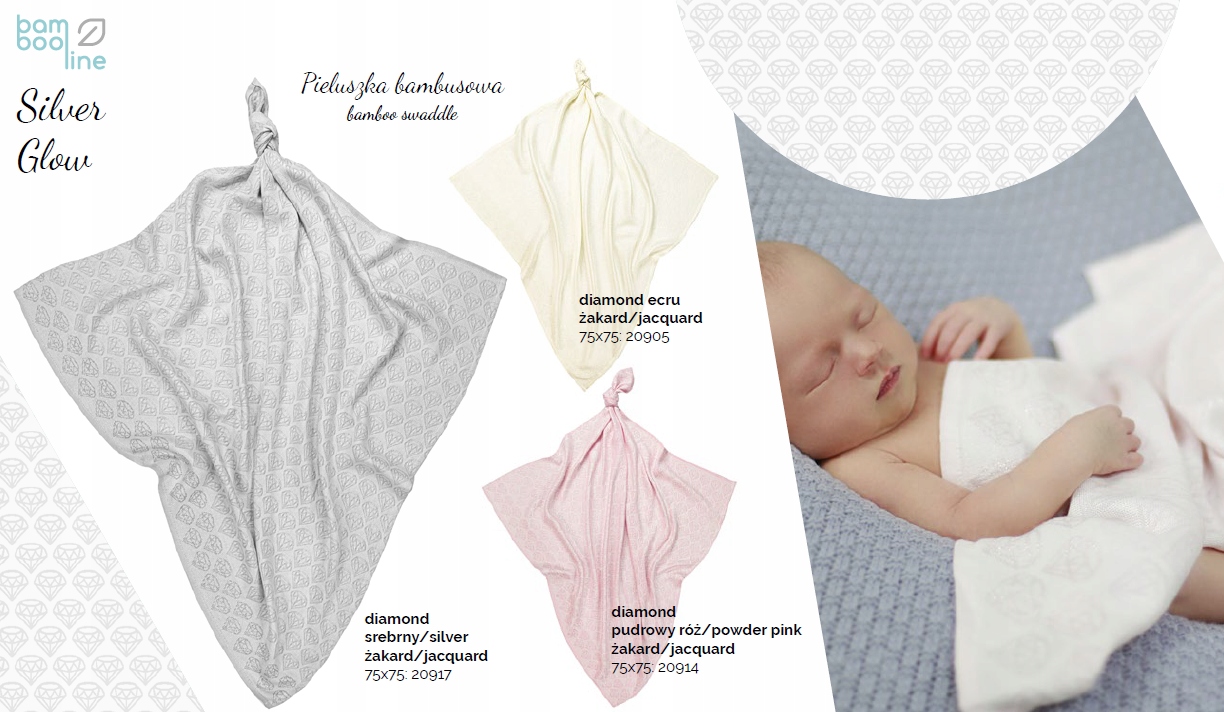 Silver Glow — це остання колекція жакардових бамбукових підгузників, яка розширює класичну лінійку Bamboo абсолютно новими малюнками та кольорами. Відмінною рисою всієї колекції є використання срібного волокна при плетінні пелюшок, що надає блиску всім деталям, що, безсумнівно, привертає увагу як малюка, так і мам, які обирають виріб.Це, безсумнівно, чудова ідея для подарунка на хрестини. .