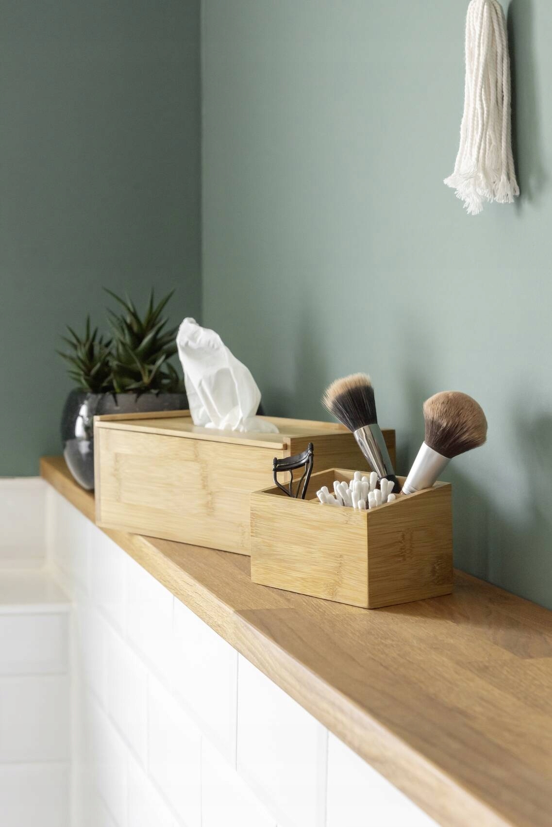 Скринька з тканин з бамбука прикрасить Вашу ванну кімнату, вітальню або спальню. Він дуже міцний і стійкий до вологи та деформації.Має розміри 25 х 13 х 10 см, що відповідає розмірам стандартних серветкових контейнерів, які є у вільному продажу. Просте закриття дозволяє легко наповнювати контейнер.
