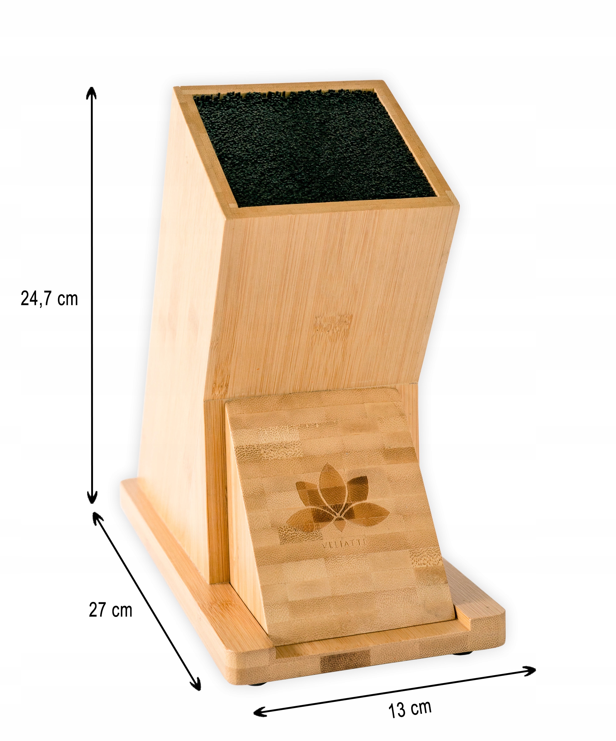Найвища якість. Наша підставка для ножів виготовлена з бамбука преміум-класу – матеріалу, який цінується за його довговічність і міцність. Бамбук — це не лише природна краса, але й екологічний вибір, оскільки це одна з найбільш стійких сировинних матеріалів на Землі, яка швидко росте та не потребує використання пестицидів.