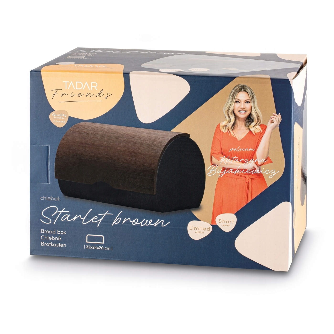 Бронзовий Starke Pro Starlet Brown 32 x 24 x 20,5 см був виготовлений з вуглецевої сталі. Модель закрита у вигляді дерев’яної лакованої кришки. Він захищає зміст від добре забруднення та світла. Він також забезпечує безкоштовний доступ до вмісту. Закриття є бамбуковим, міцним і нахиленим. Продукт має смачну матову обробку і є просторим. Елегантність йому надається простим формою та кольоровою палітрою. Він розмістить хліб та рулони для всієї родини. Це пропозиція для тих, хто цінує свіжість, хрусткість та аромат свіжого хліба і шукає тверду ємність хліба. Ви можете стабільна зоряна хліборобка на кухонному прилавку, оскільки у нього є ноги, що не мають ковзання. Не дивно, що колекцію рекомендують театр та кіно актриса Катаржина Буджакевич. Продукт є частиною пропозиції, яка відкриє нову серію Starke Pro під назвою Tadar та Friends!