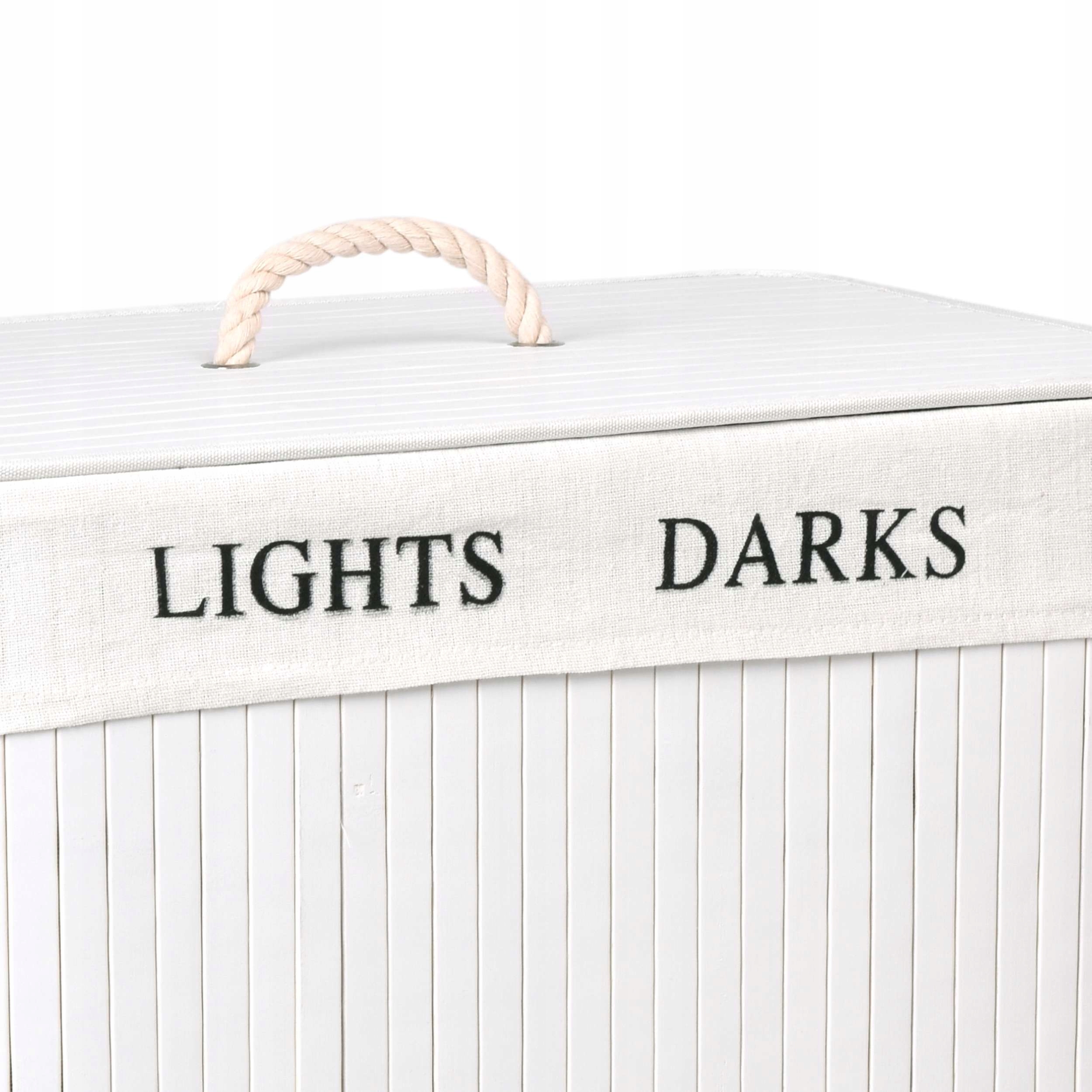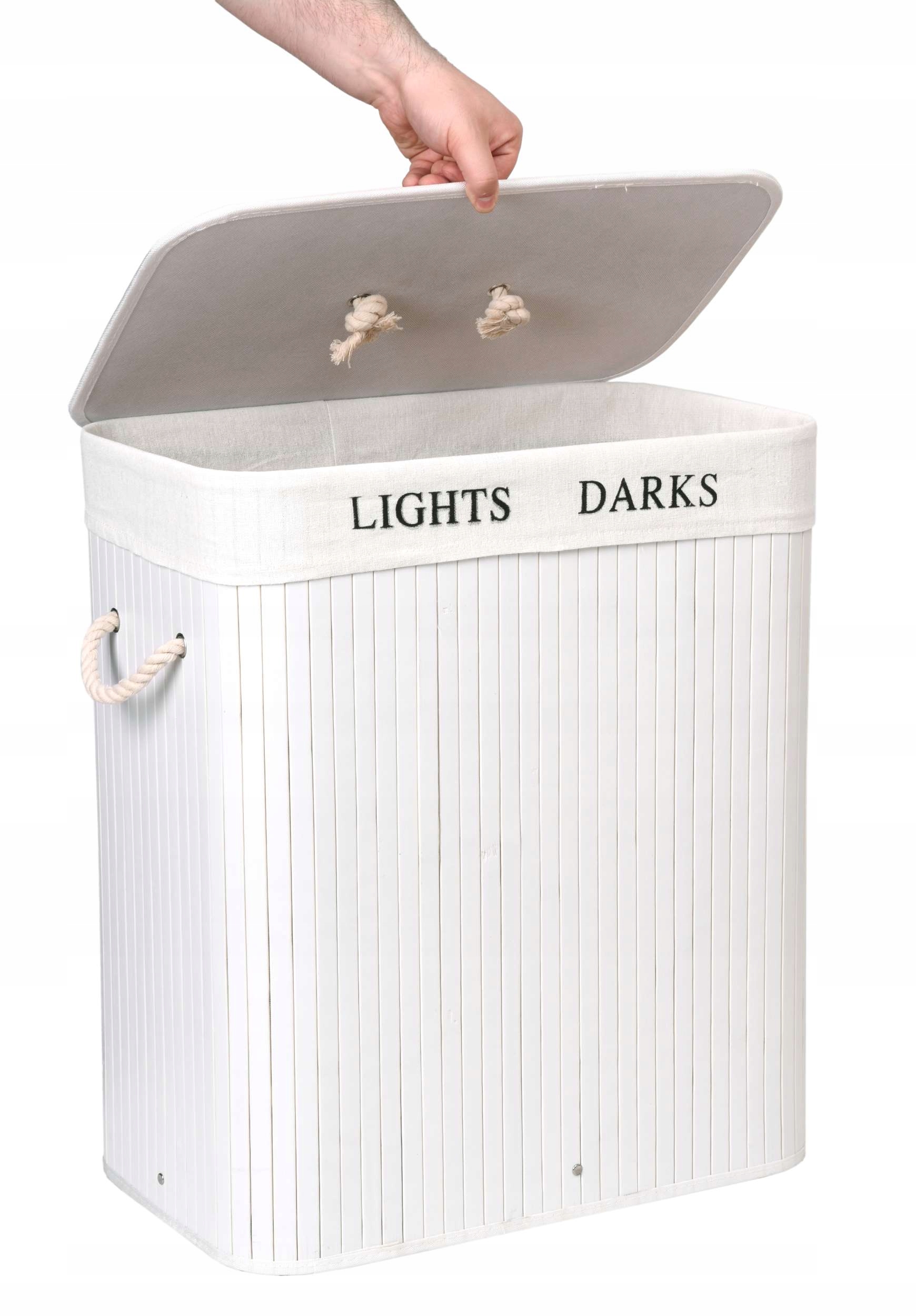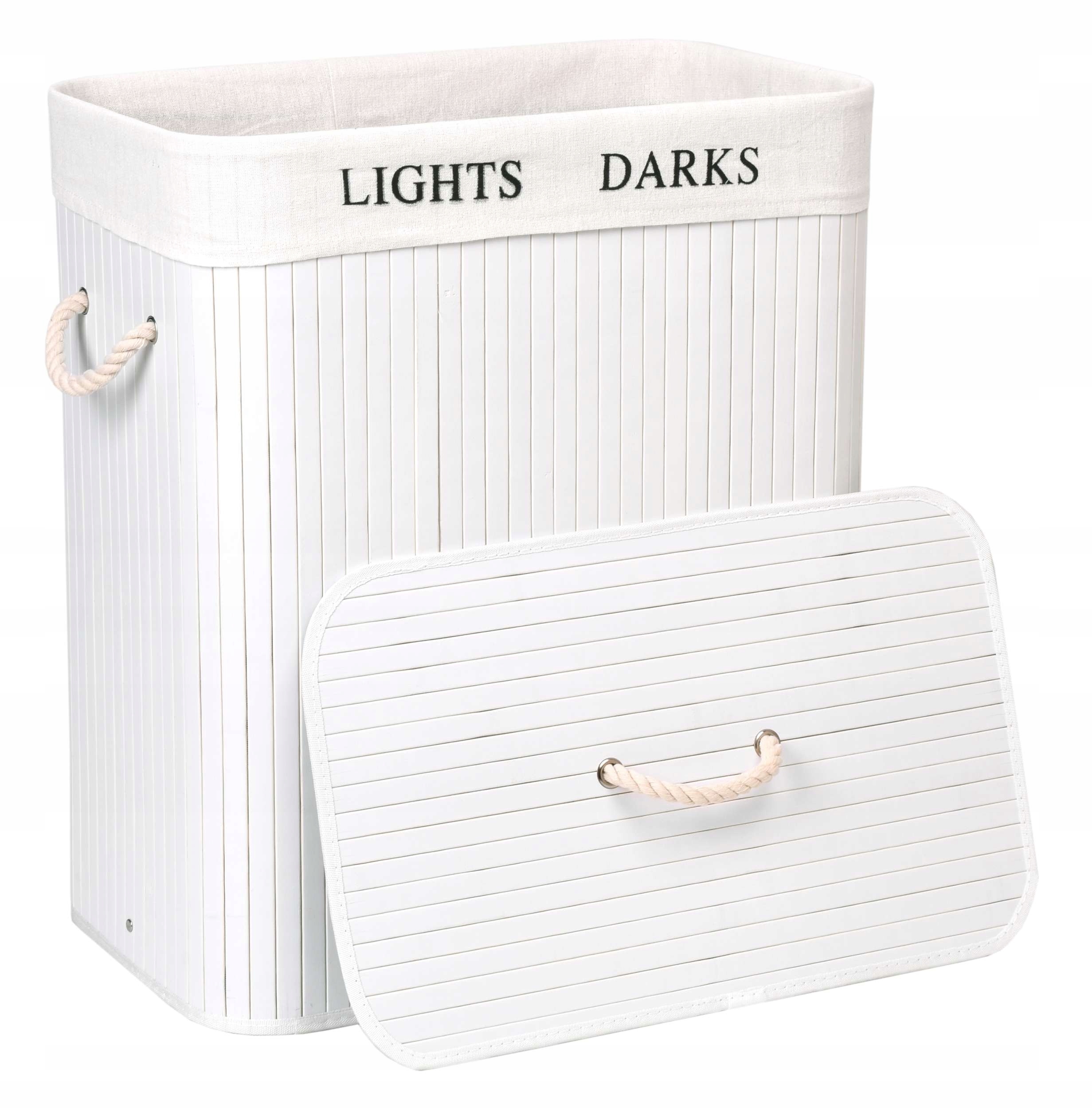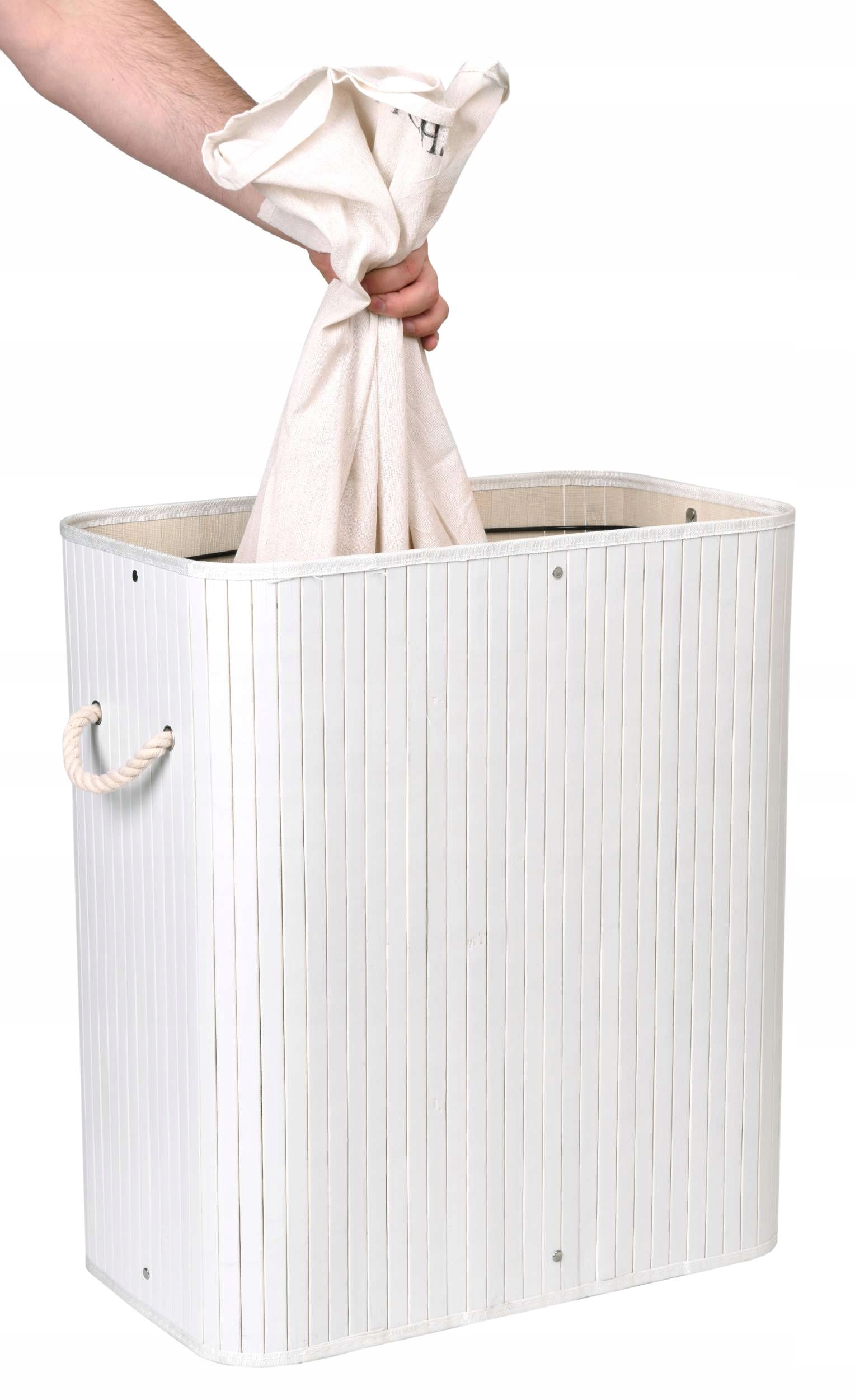 Кошик з натурального бамбука для збору брудного одягу та білизни перед пранням. Дуже практичним рішенням є розділення вмісту ємності на дві частини, призначені для світлого і темного одягу. Простий і природний вигляд дозволяє контейнеру вписатися в будь-яке приміщення. Перевагою бамбукового кошика, безсумнівно, є його елегантний зовнішній вигляд, який перевершує звичайну пластикову тару. Кошик оснащений внутрішньою знімною вставкою з матеріалу, яка не вбирає вологу та неприємні запахи. Конструкція контейнера стійка і жорстка.