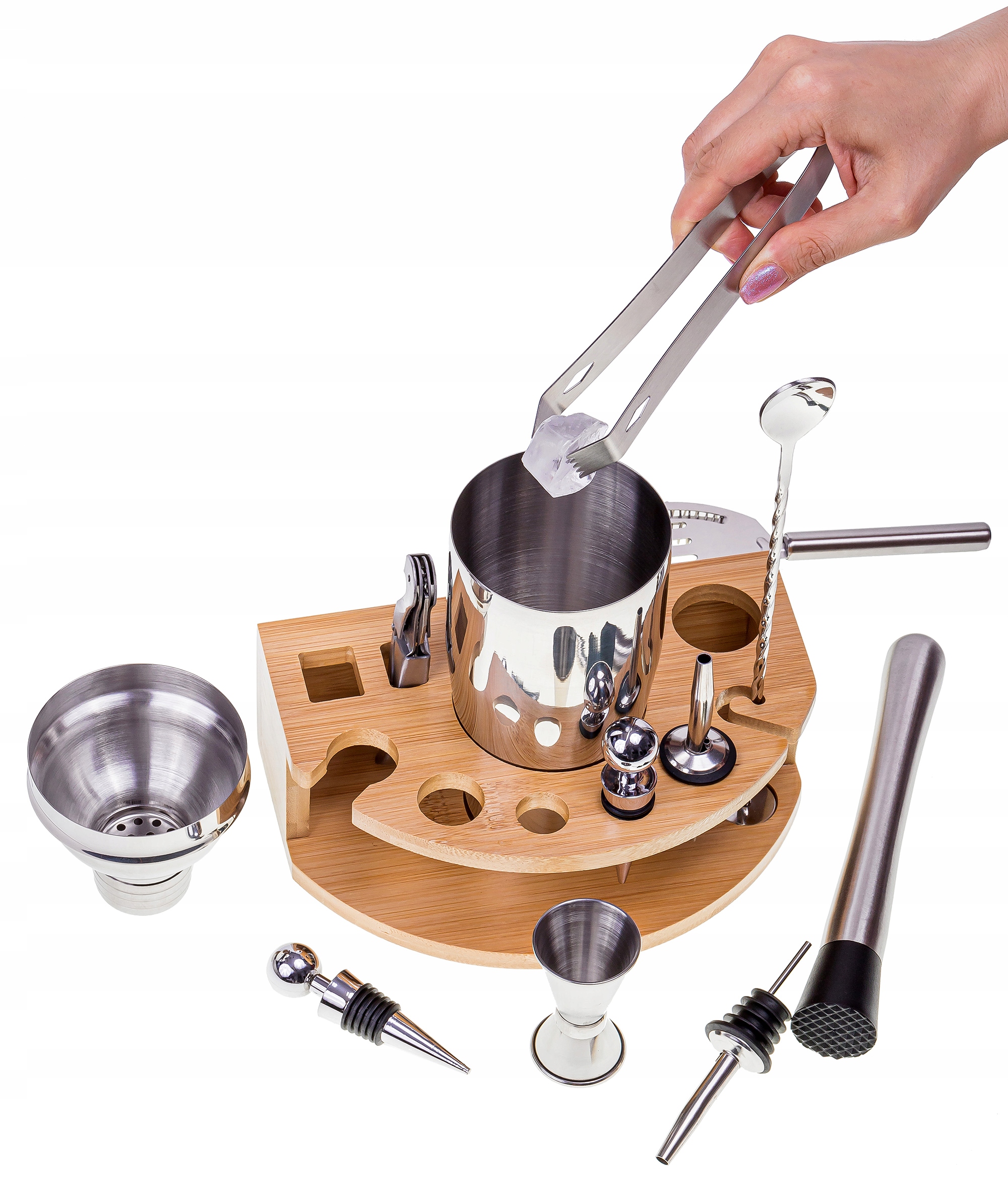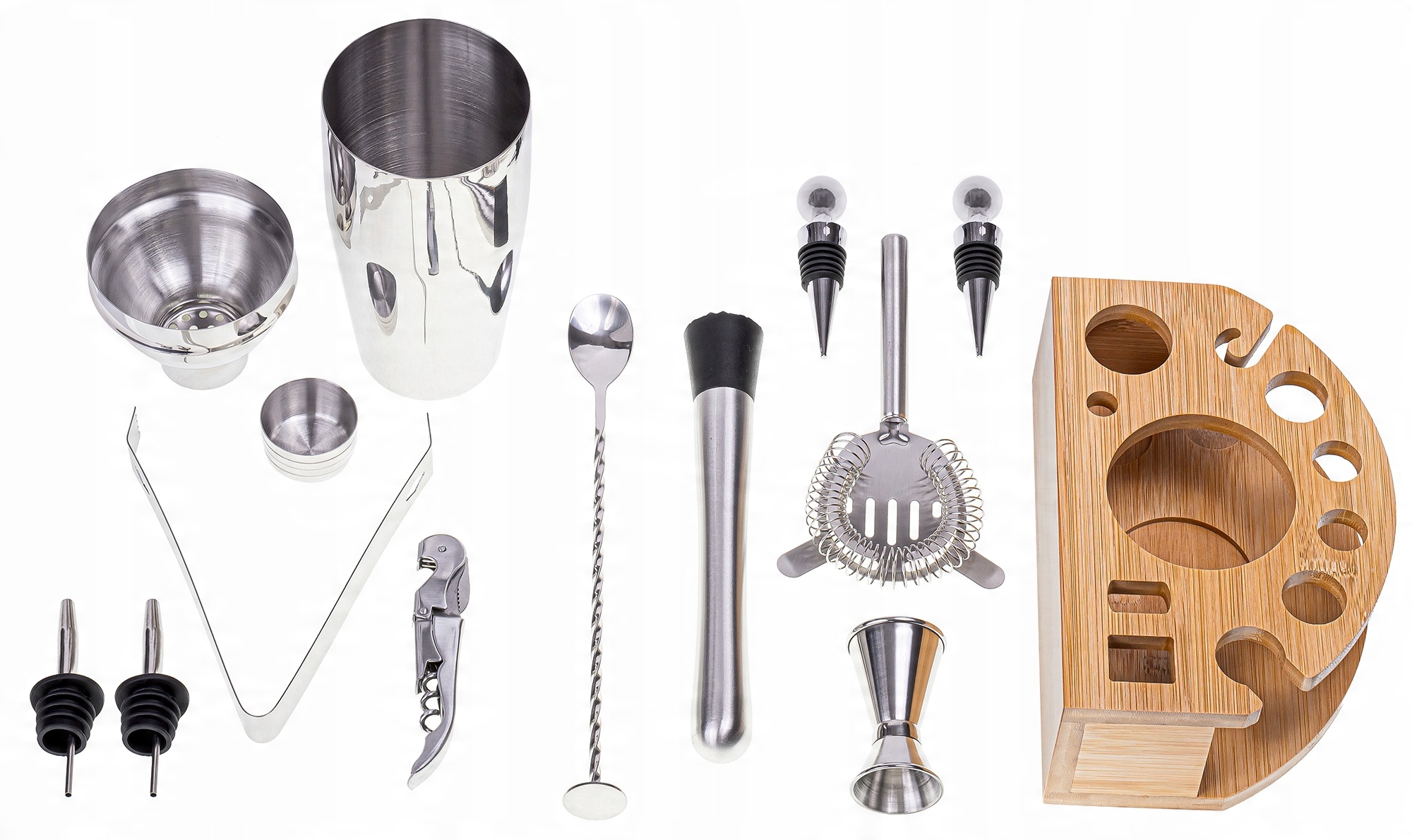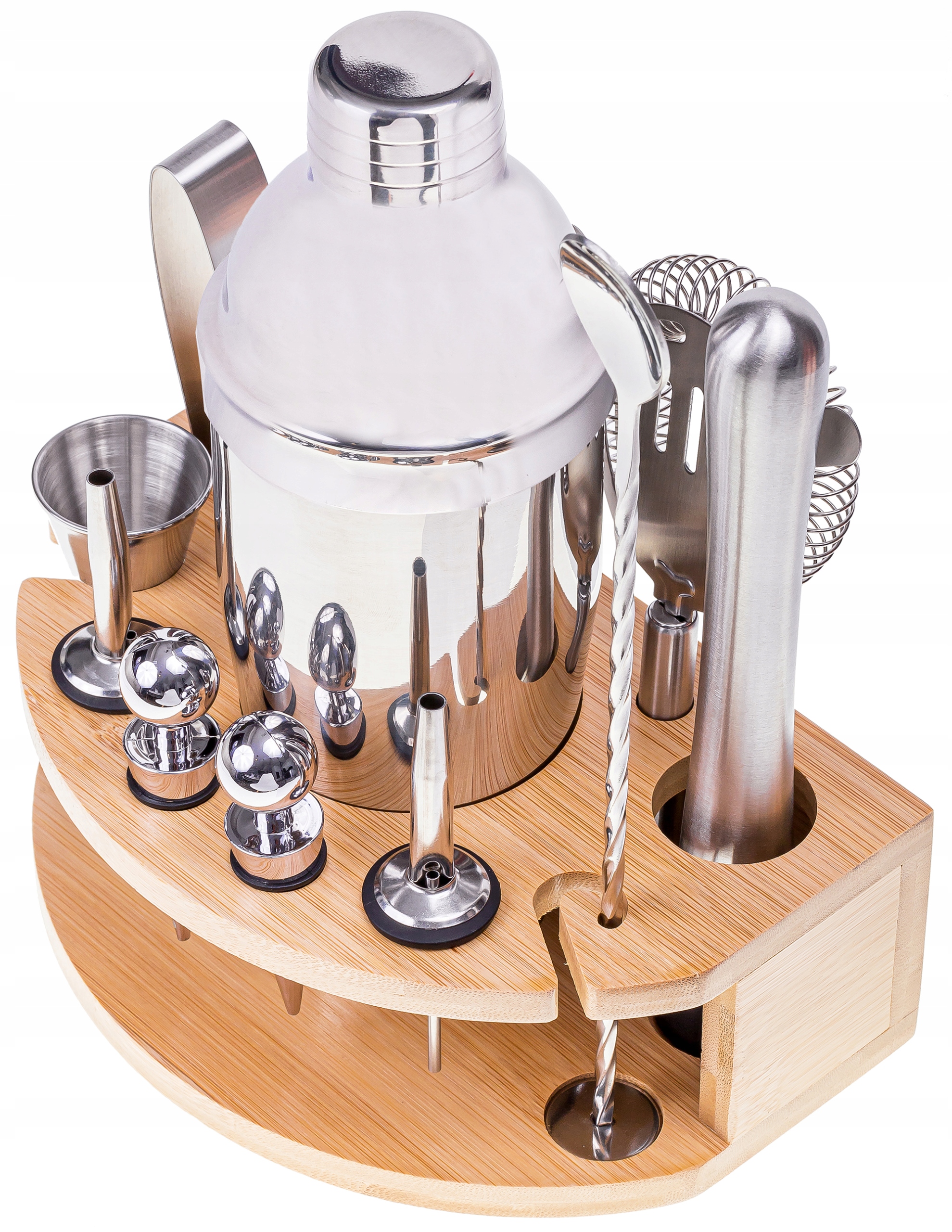 Барменський набір із нержавіючої сталі з бамбуковою підставкою – це насамперед пропозиція для тих, хто хоче легко та зручно готувати напої.