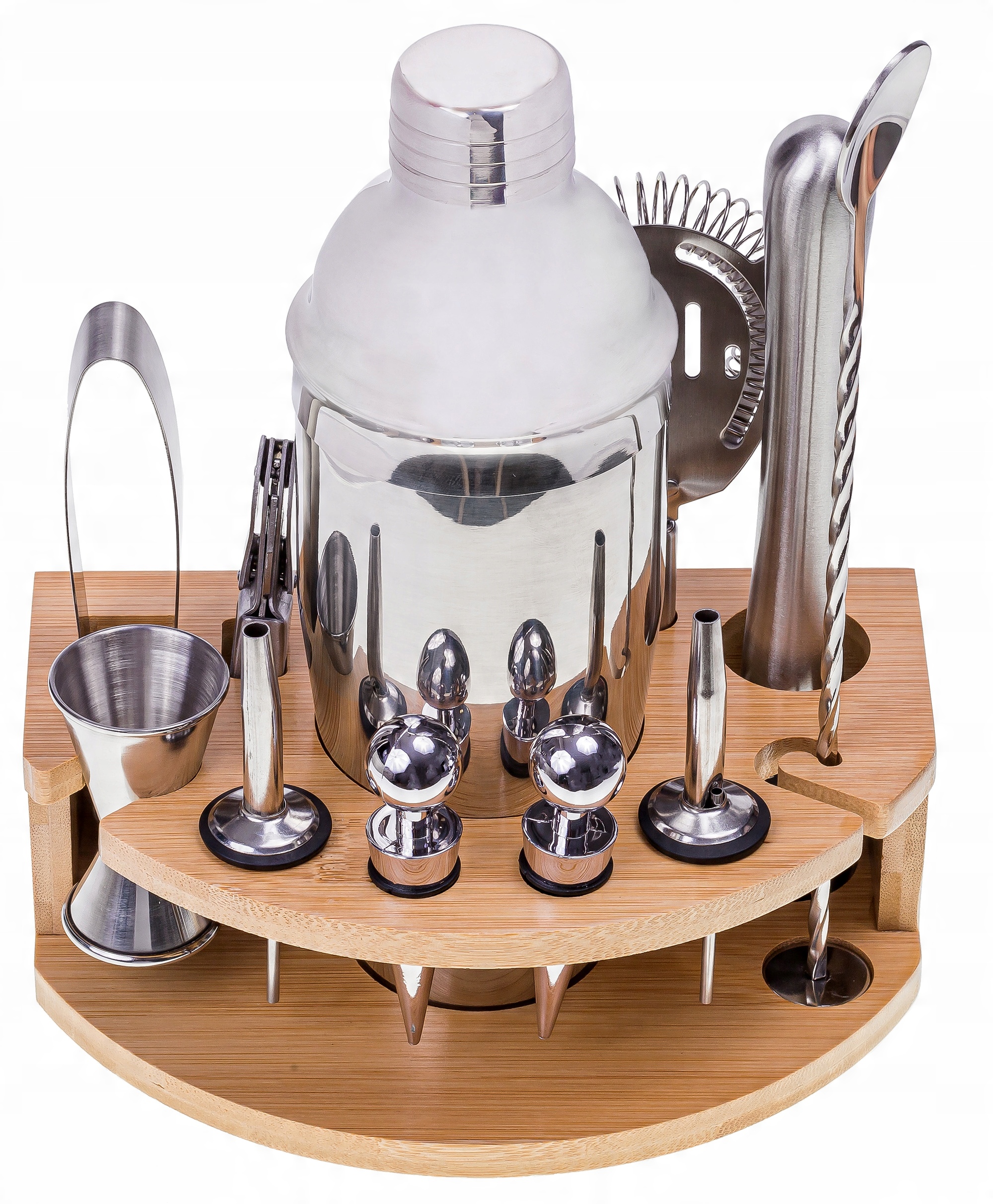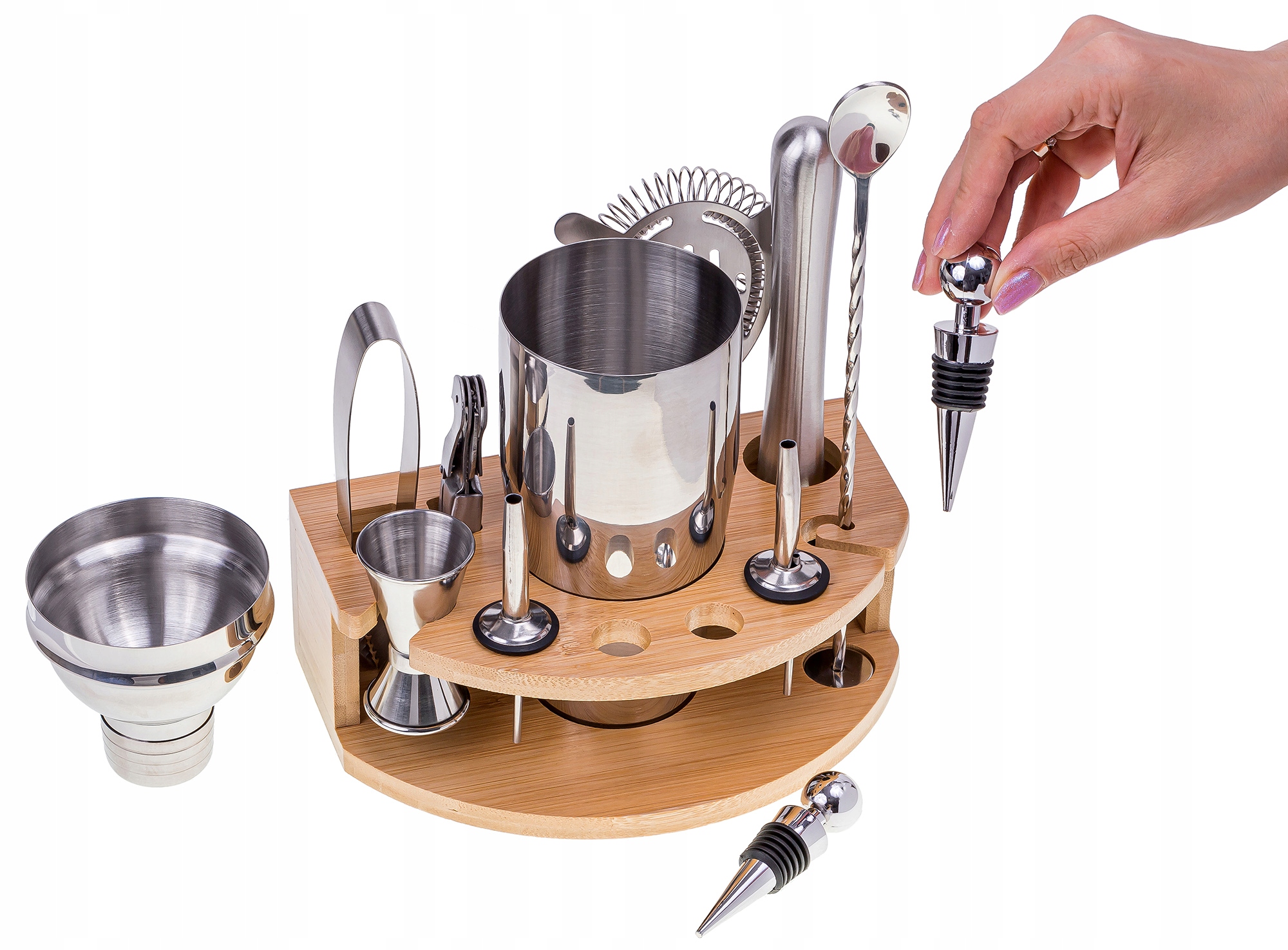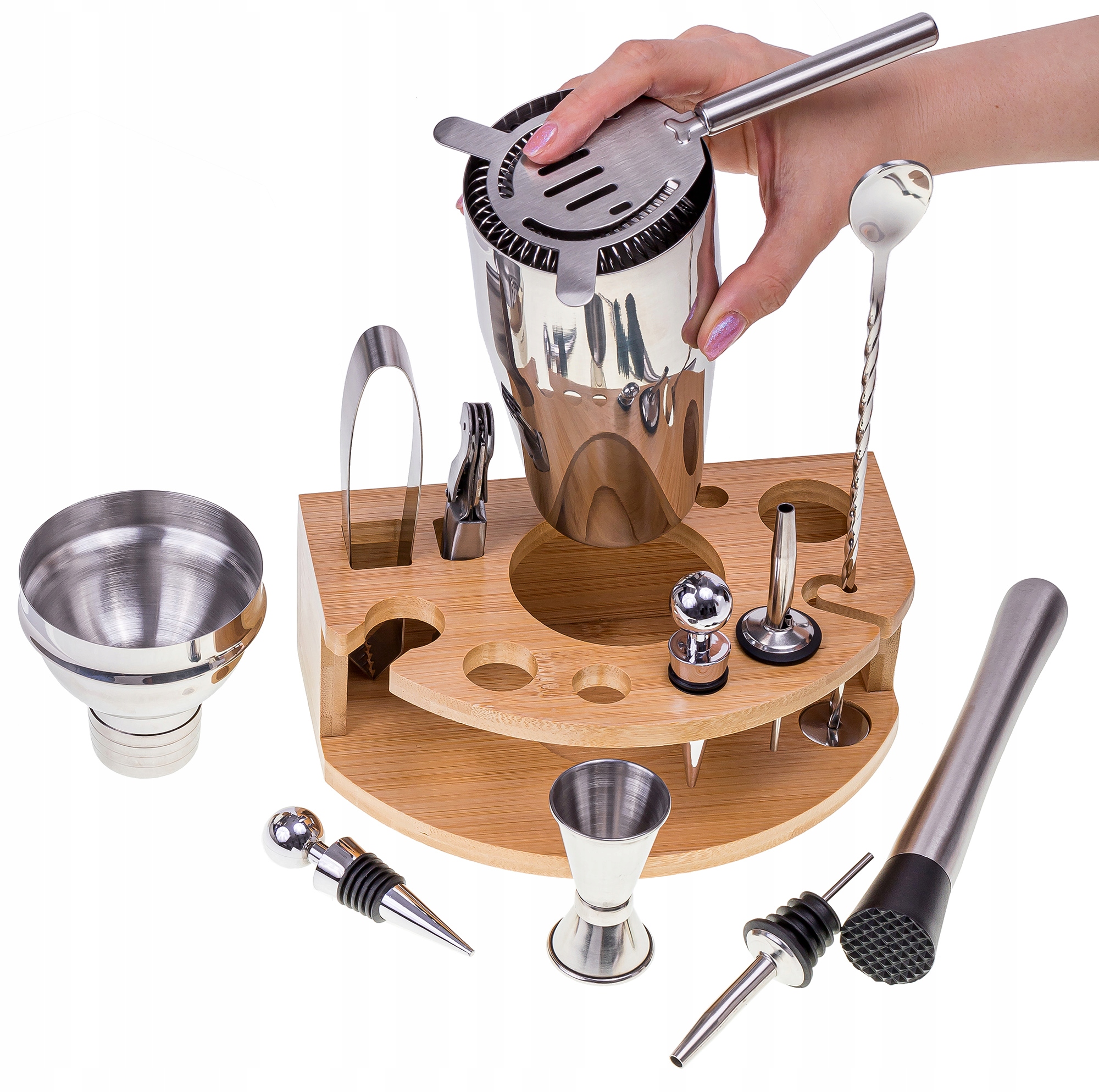 Барменський набір із нержавіючої сталі з бамбуковою підставкою – це насамперед пропозиція для тих, хто хоче легко та зручно готувати напої.