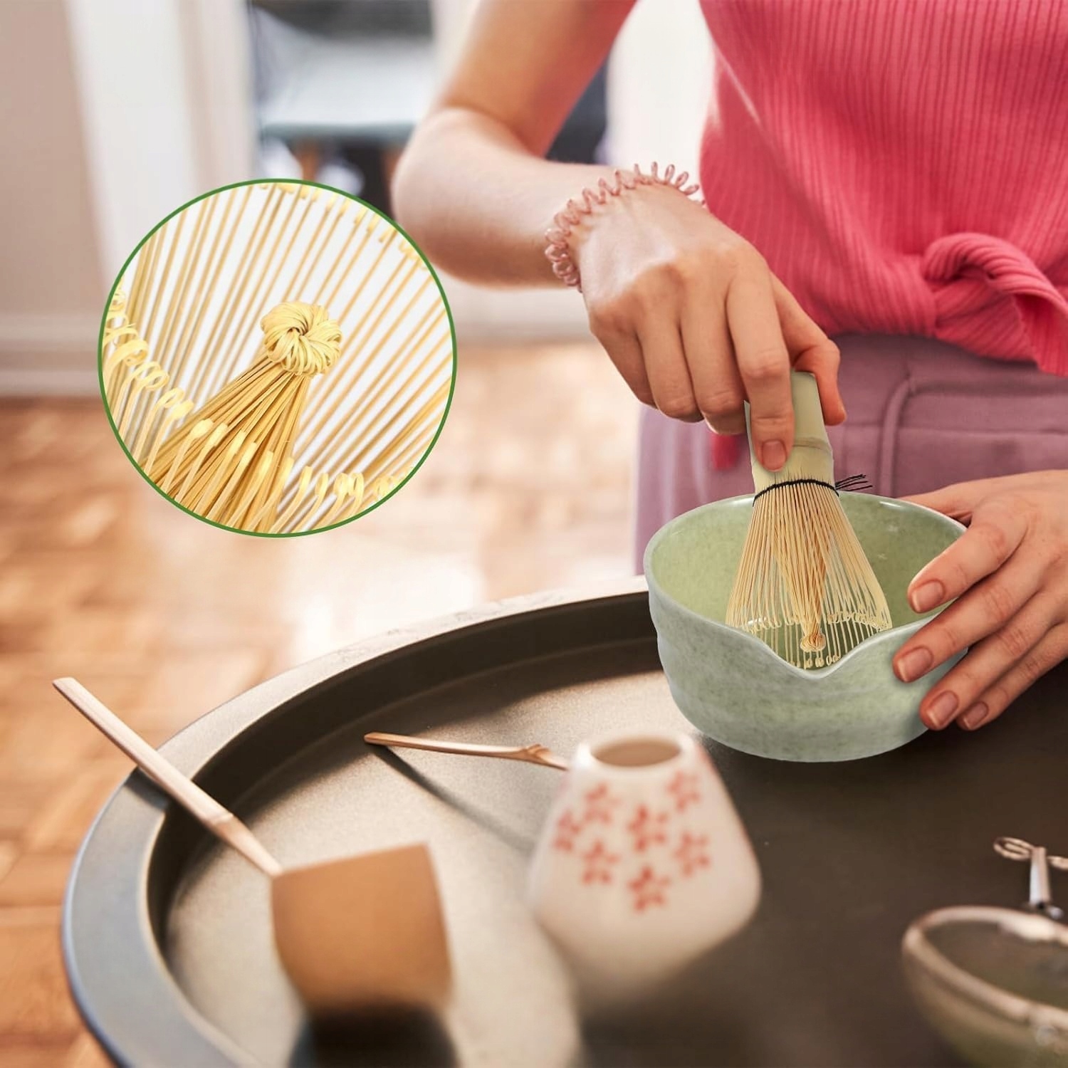 Традиційні металеві мішалки можуть зробити ваш чай гірким. Цей традиційний чайний набір матча допоможе вам змішати м’яку піну порошку матча.