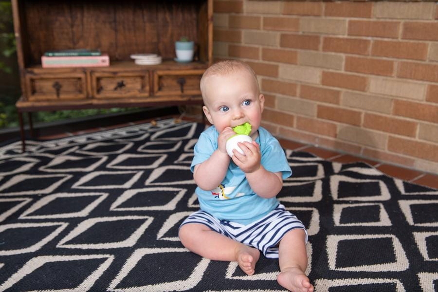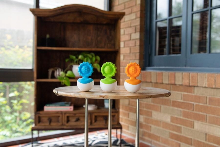 З одного боку зелена силіконова бульбашка, яка мізинцями може виштовхуватися , в силіконовій рамці, з невеликими виступами по всьому, що стимулює відчуття дотику; з іншого боку, круглий вафельний підйомник для розгойдування та обертання , завдяки чому силіконова частина прорізувача ніколи не буде лежати на підлозі. Прорізувач Dimpl захопить дітей своїм рухом, зовнішнім виглядом і текстурою. Справжня радість для почуттів дитини.