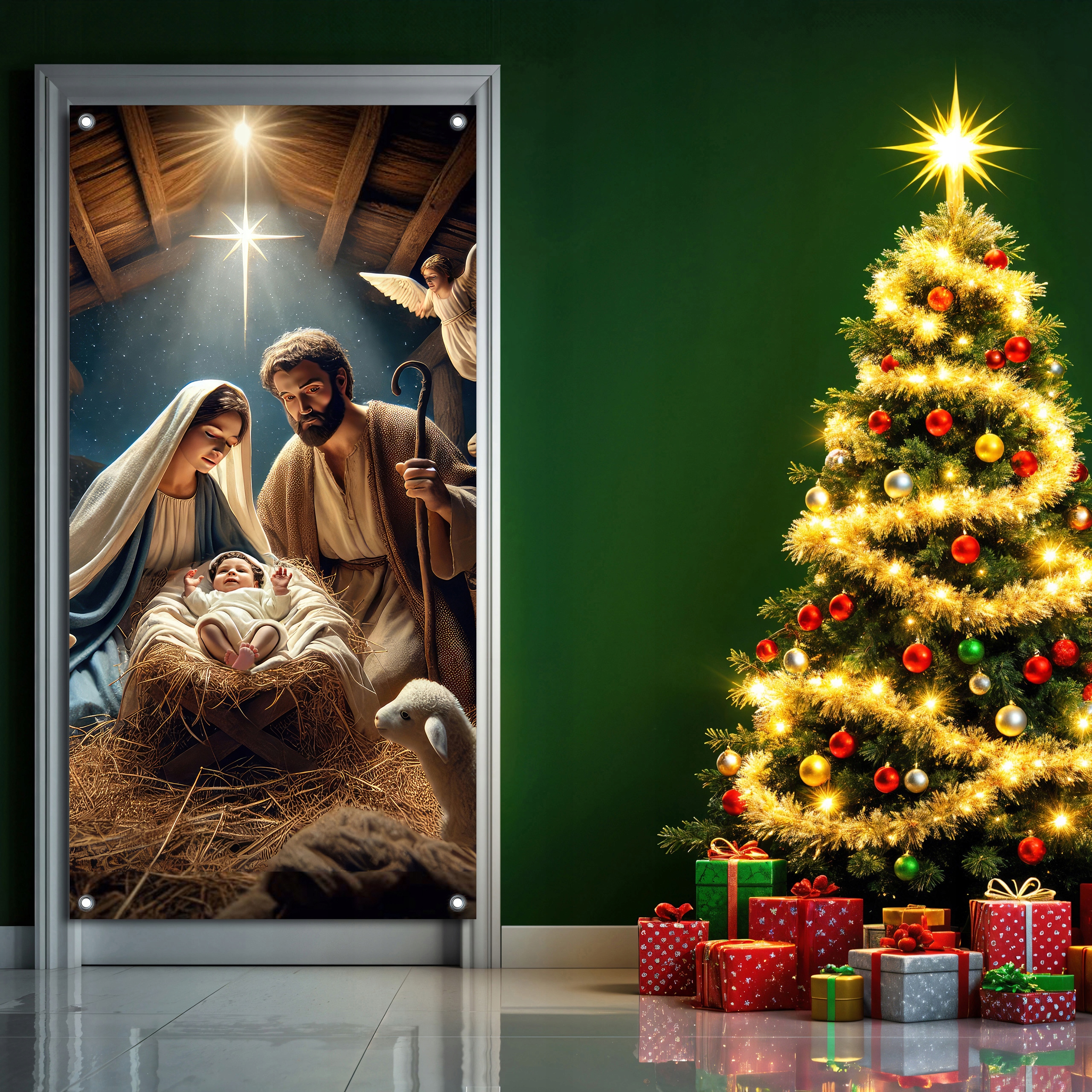 Банер представляє класичну різдвяну сцену, що показує Священну родину в стабільній. В ідеалі підходить для прикраси вхідних дверей, для дитячої кімнати або для сцени Різдва в школі чи церкві. Це додасть магії будь -якому інтер'єру та підкреслить святкову атмосферу! Фон утримується в теплих, святкових кольорах, таких як глибокий синій, золотий та ніжний відтінок коричневого, що надає всьому урочистому персонажу. Яскраві кольори та детальні конструкції привертають увагу і захоплюють як домогосподарство, так і гості.