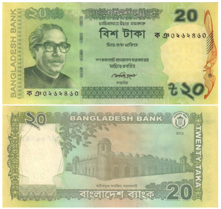 BANGLADESH 20 TAKA 2012 P-55Aa(1) UNC, серійний номер банкноти може відрізнятися від зображеного на фото.
