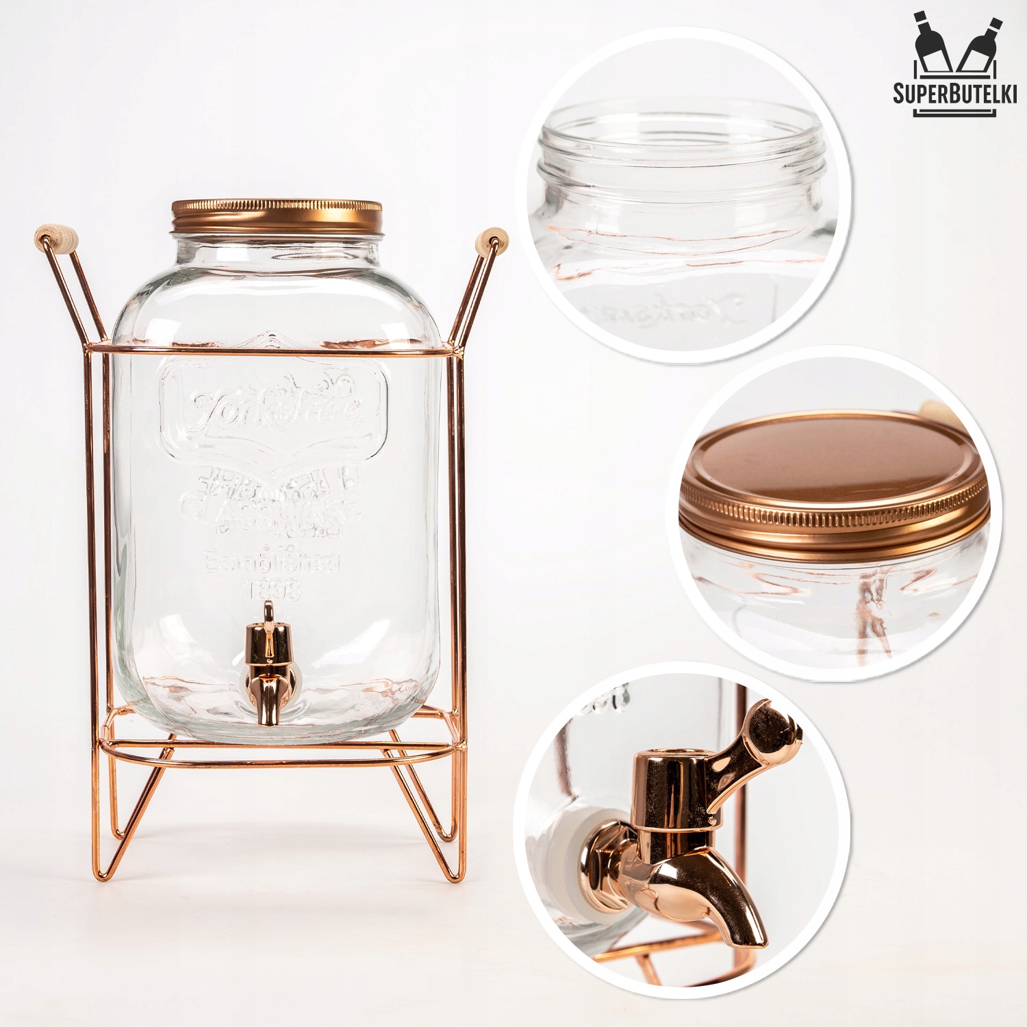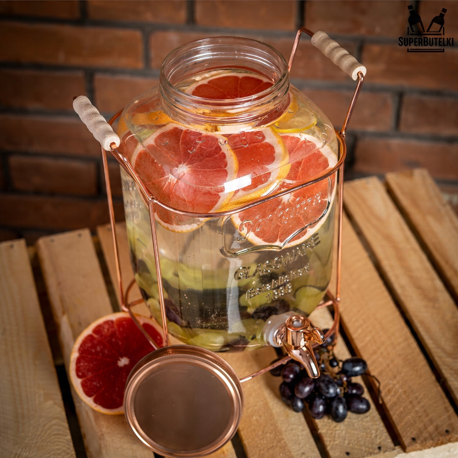 Завдяки крану ємність ідеально підійде для подачі напоїв і алкогольних напоїв під час візиту гостей. Металева ручка з дерев'яною ручкою полегшує перенесення ємності та підкреслює декоративність банки.