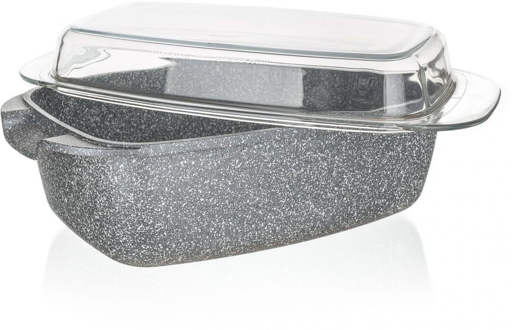 Британський граніт 5,7 л зі скляною кришкою, антидгезивне покриття гранітного малюнка. Розміри: 32,5 x 21 x 11 мм, товщина стінки 2,2 мм, товщина нижньої частини 4,7 мм. Британці оснащені повністю індуктивним дном, покритим антистійким антистійким покриттям. Ви можете мити в посудомийній машині.