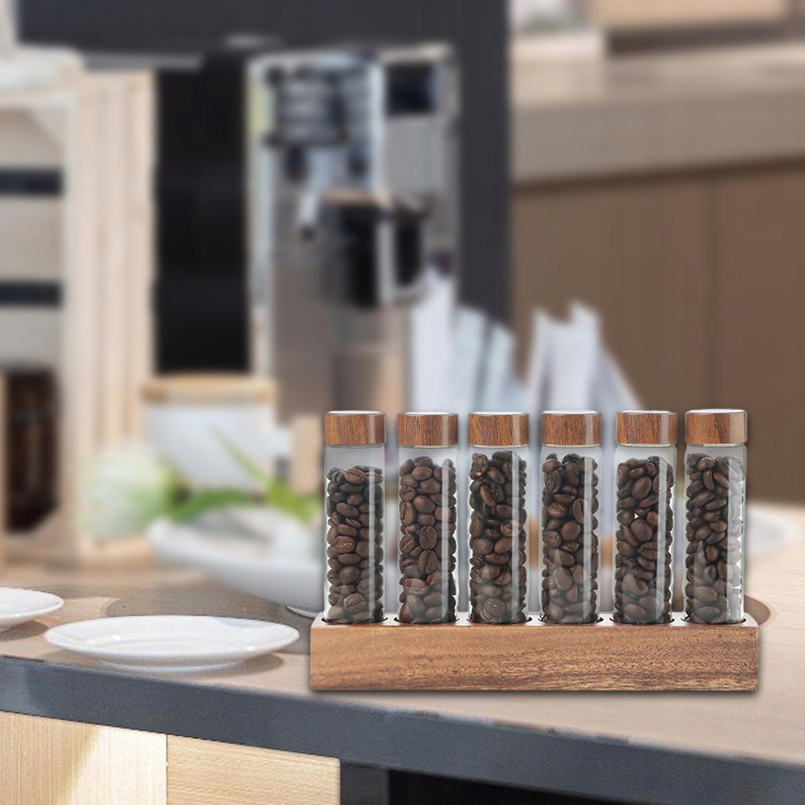 [упаковка]: Скляні трубки для зберігання кавових зерен оснащені основою з горіхового дерева, 6 шматочками скляних труб.