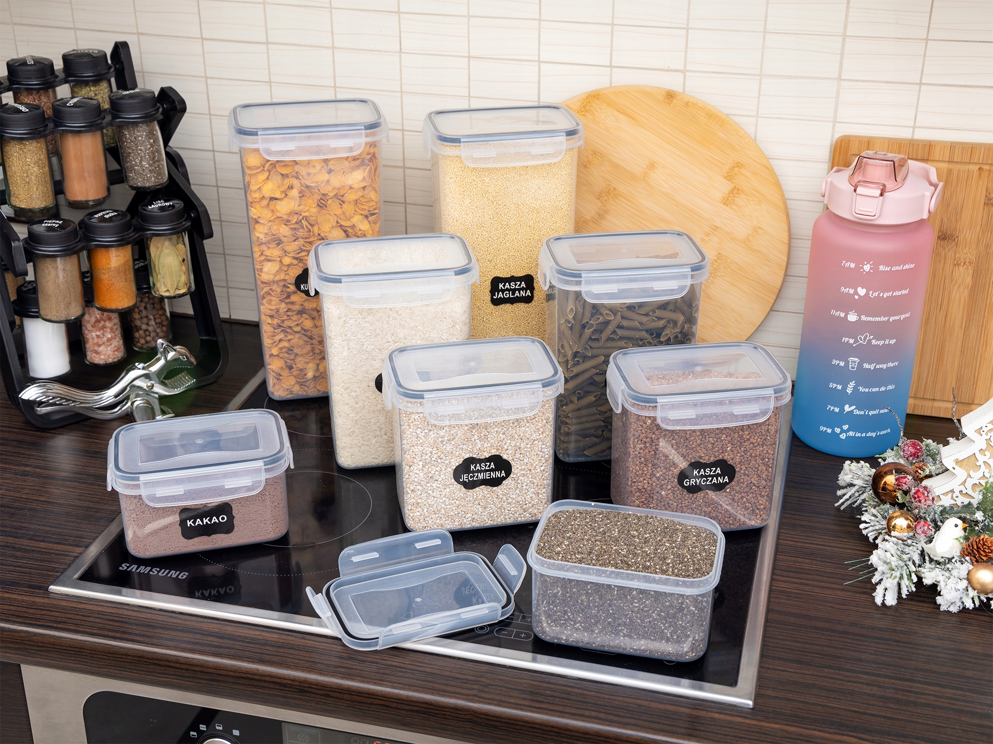 Кожна з цих контейнерів оснащена твердою пластиковою кришкою, яка забезпечує жорсткість і захищає вашу продукцію від вологи та втрати свіжості. Макарони та кава тривалий час залишатимуться у відмінному стані.