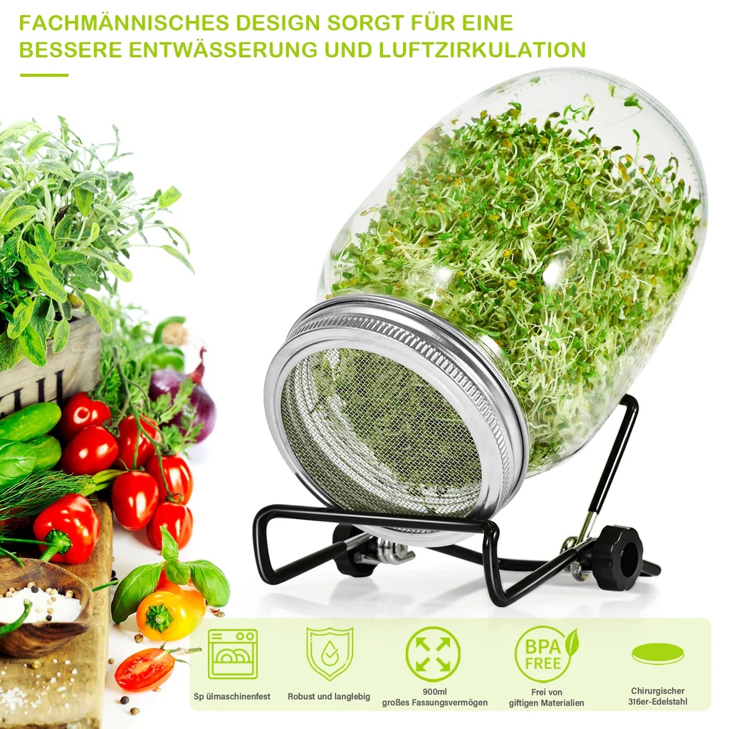 - ПОВНИЙ НАБІР ДЛЯ ПРОРОЩУВАННЯ: усе, що вам потрібно, щоб виростити смачні паростки вдома, набагато свіжіші! (Насіння не включено) Пакет містить 2 чохли для плафонів, 2 банки з широким горлом по 32 унції, 2 316 кришечок для паростків, 1 піддон для крапель, 1 304 решітки та інструкції