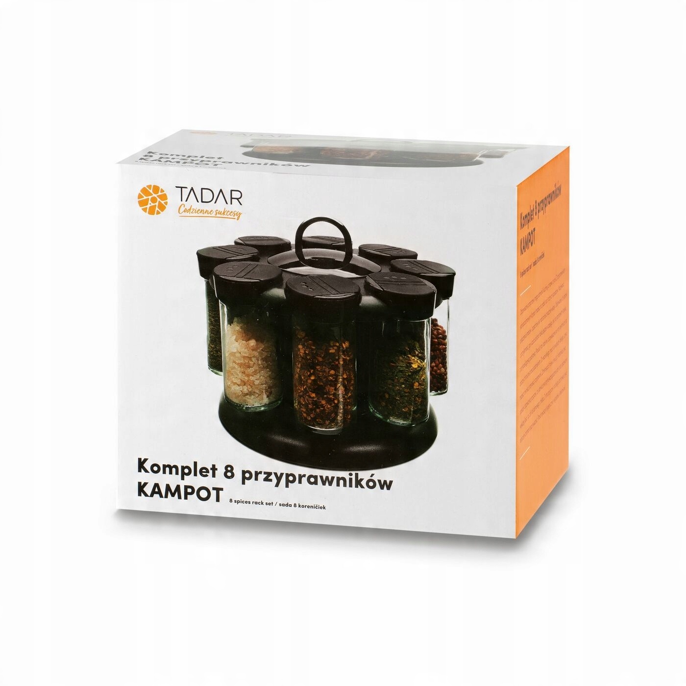Набір спецій Тадар Кампот із 8 спеціями поєднує в собі міцність і функціональність. Скляні ємності мають пластикові кришки. Вони дозволяють ефективно та точно приправляти їжу двома різними способами. Поворотна підставка стійка і однорівнева. Його основа не ковзає. Спосіб розміщення банок, з яких складається спеція Кампот, запобігає їх вислизанню під час використання або перенесення продукту. Ви можете легко переміщати модель завдяки металевій ручці. Ви можете розмістити його в межах досяжності. Він допоможе вам організувати зберігання найбільш часто використовуваних спецій, таких як мелений перець, гранульований часник, базилік, орегано і кориця. Ви також довше збережете аромат і смак вмісту кожної з 8 кухонних спецій, розміщених на підставці. Його можна використовувати щодня, під час сезонного барбекю, і навіть при створенні соусів для піци або легких салатів для романтичної вечері. Ви також можете легко знайти спеції, оскільки баночки для спецій прозорі.