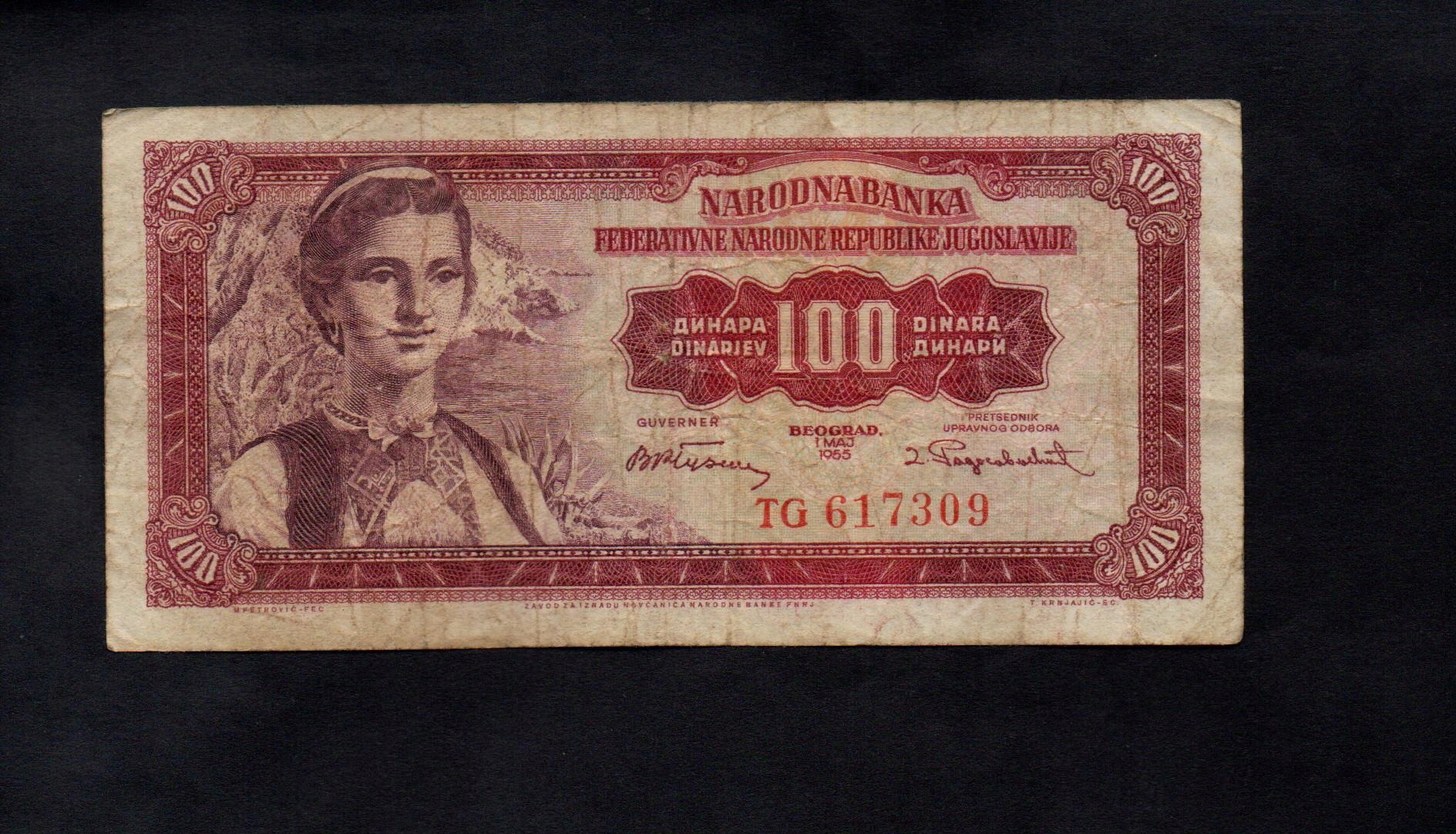 BANKNOT JUGOSŁAWIA -- 100 DINARÓW -- 1955 rok