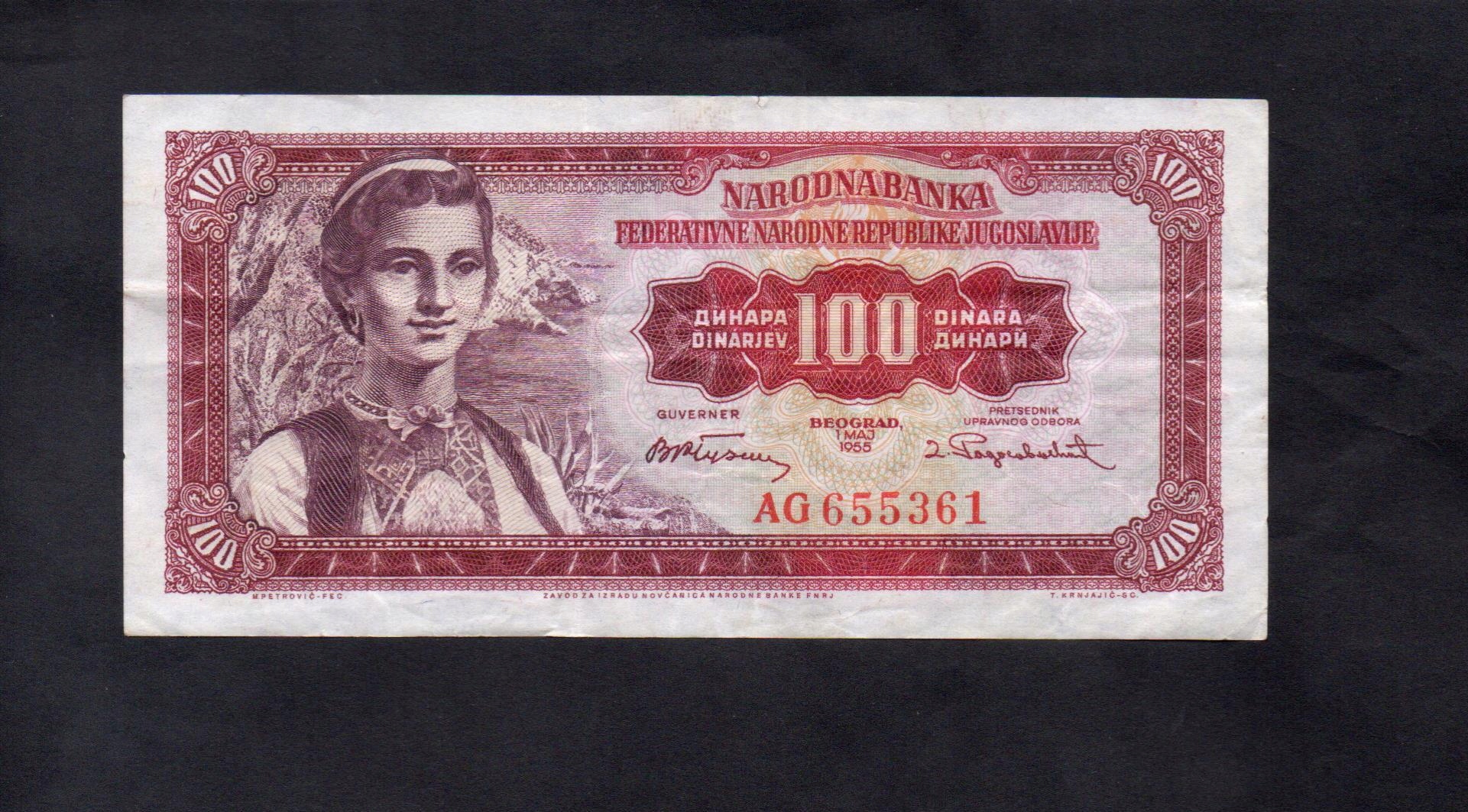 BANKNOT JUGOSŁAWIA -- 100 DINARÓW -- 1955 rok