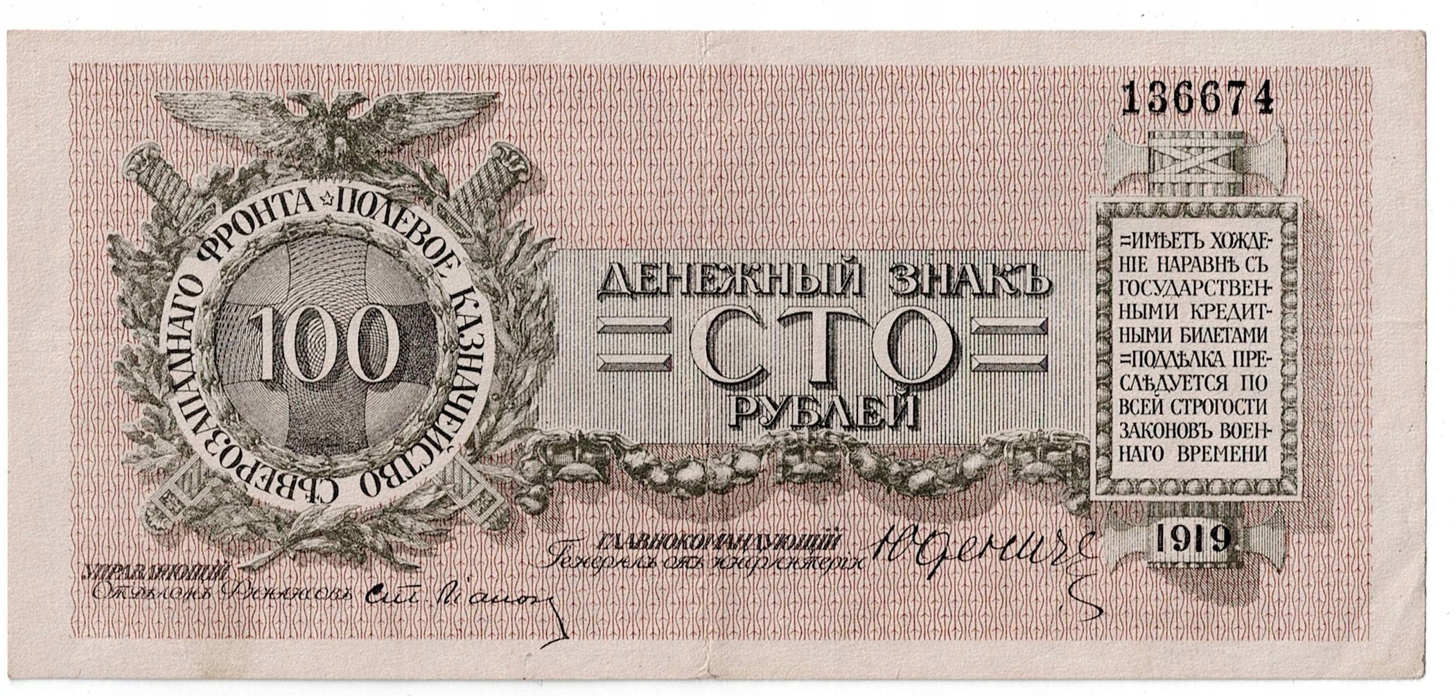 Банкнота, Росія, 100 рублів, 1919 р., Уденич