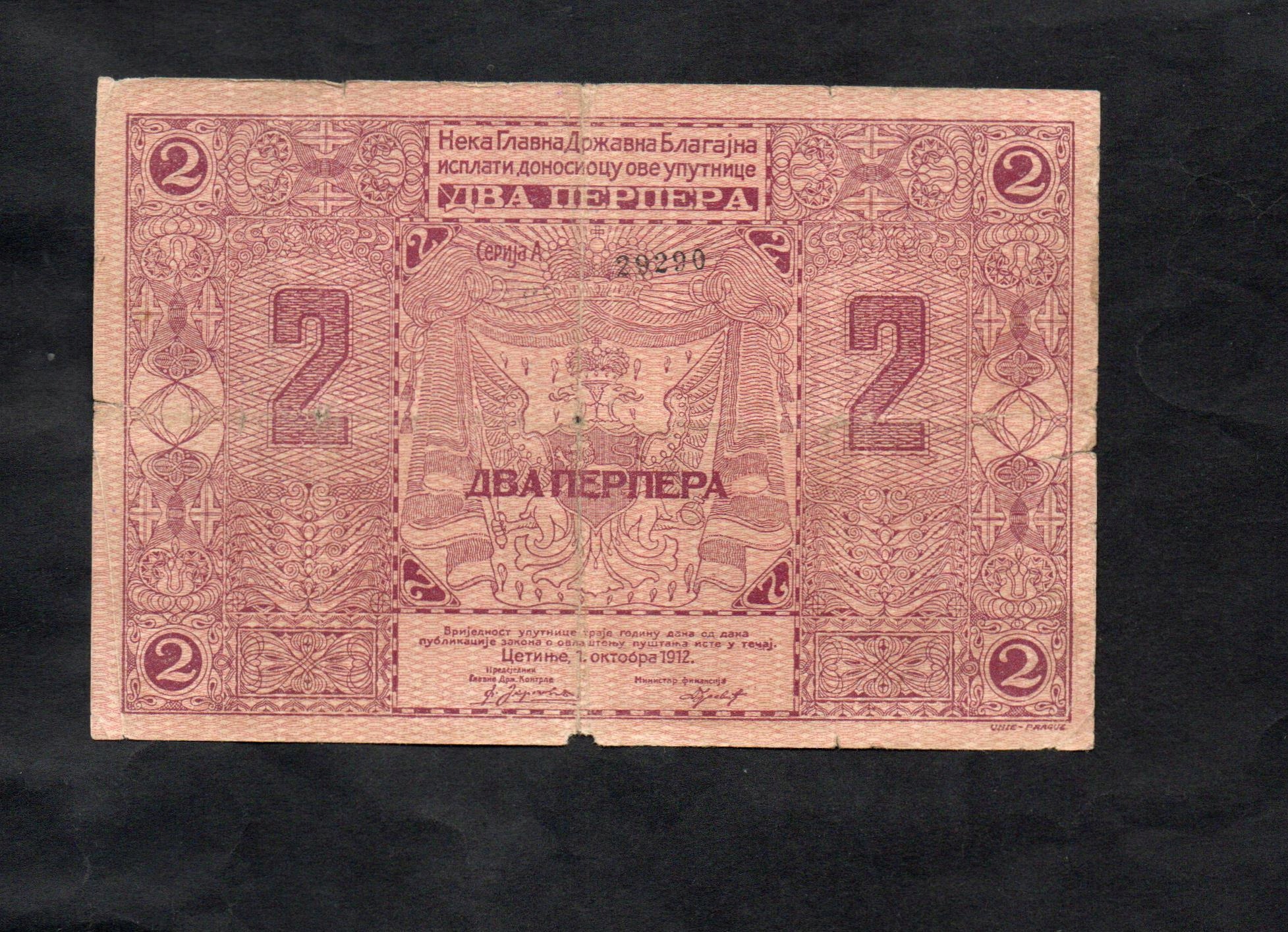 БАНКНОТА ЧОРНОГОРІЇ -- 2 PERPERA -- 1912, (B165)