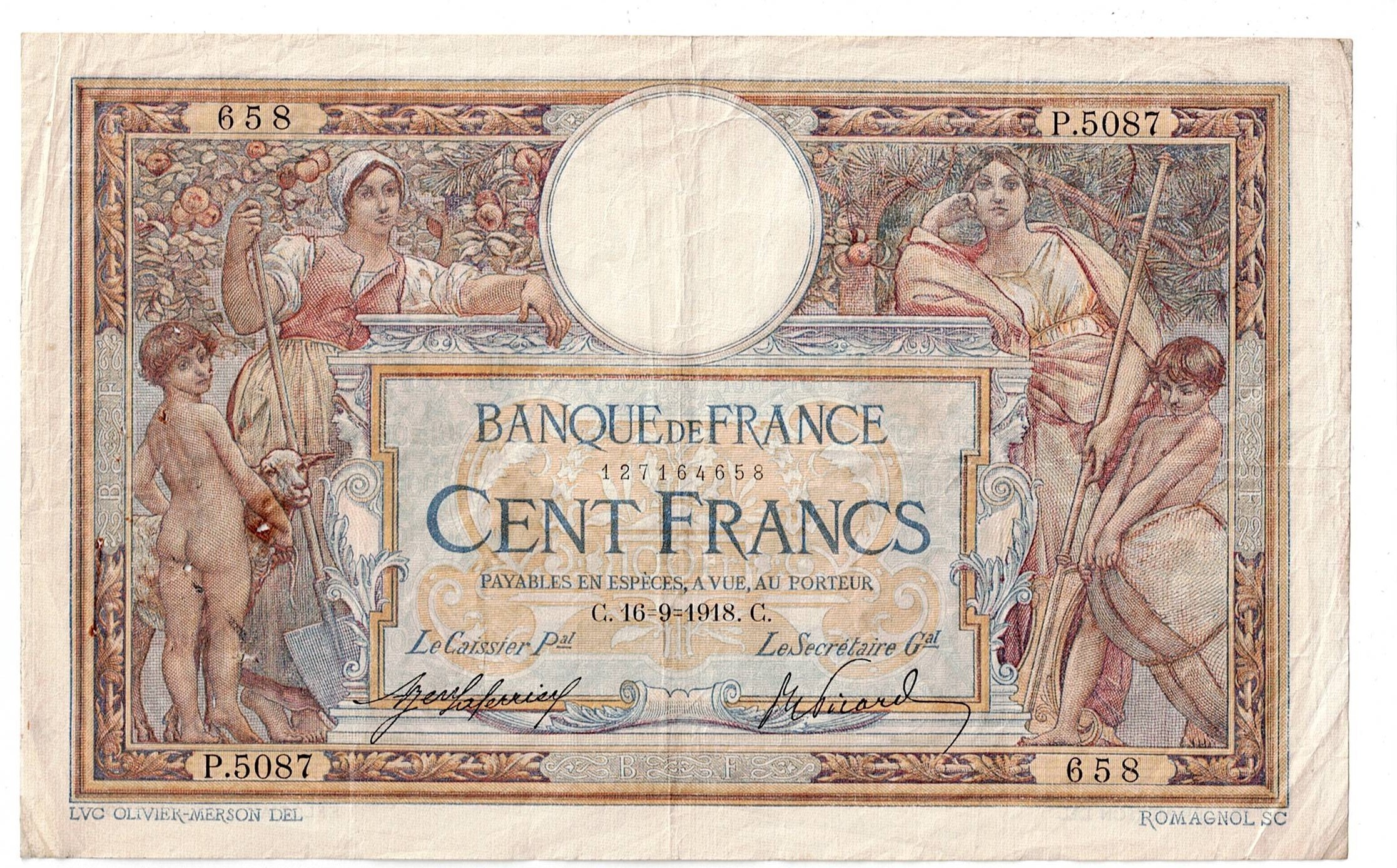 Опис: банкнота, Франція, 100 франків, 1918 рік