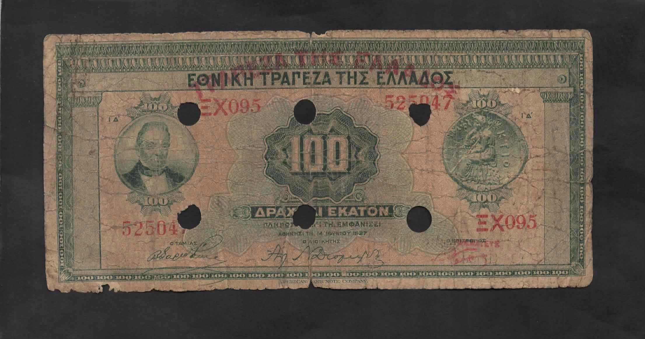 БАНКНОТА ГРЕЦІЇ -- 100 ДРАХМ -- 1927, АНУСОВАНА