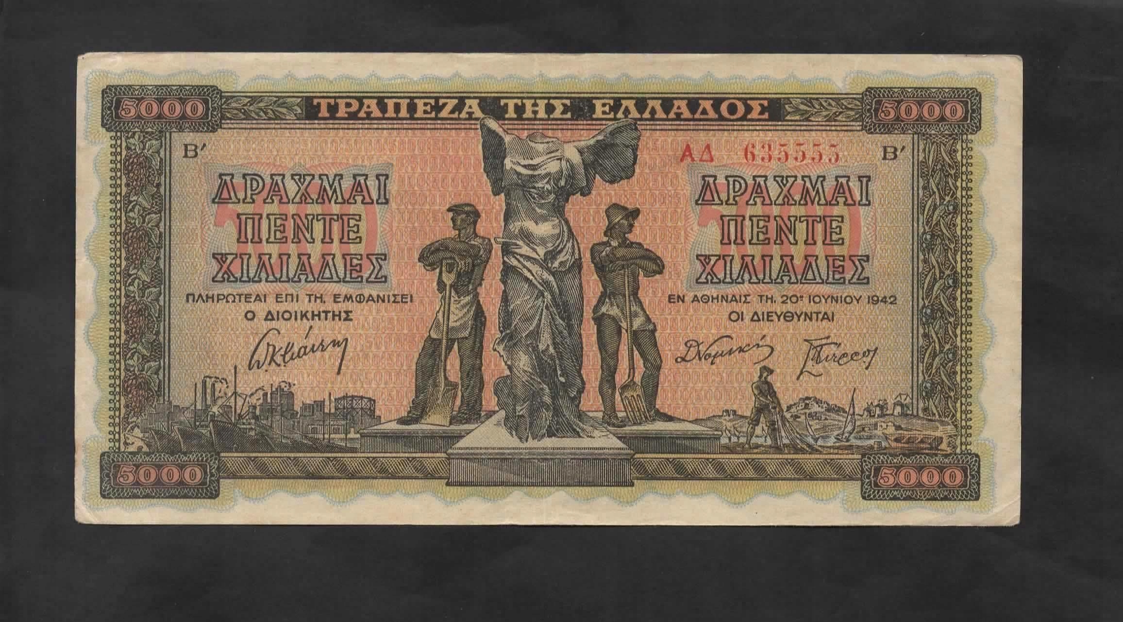 БАНКНОТА ГРЕЦІЇ -- 5000 ДРАХМ -- 1942