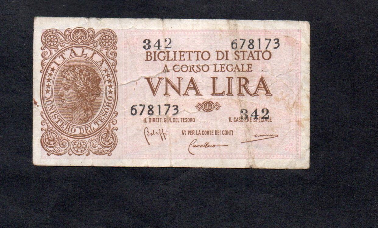 Банкнота ІТАЛІЯ -- 1 ліра -- 1944 р