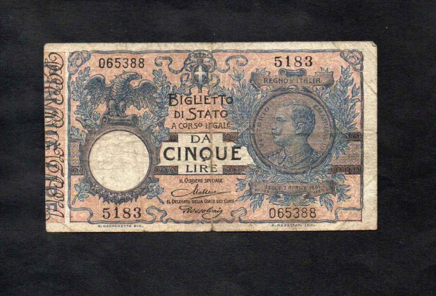Банкнота ІТАЛІЯ -- 5 лір -- 1923 р