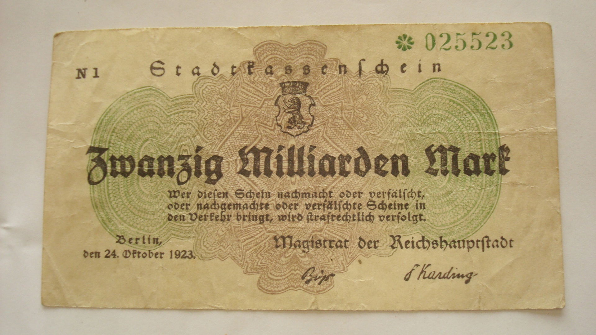 Банкнота НІМЕЧЧИНИ, 20 МІЛЬЯРДІВ МАРОК 1923 РОКУ