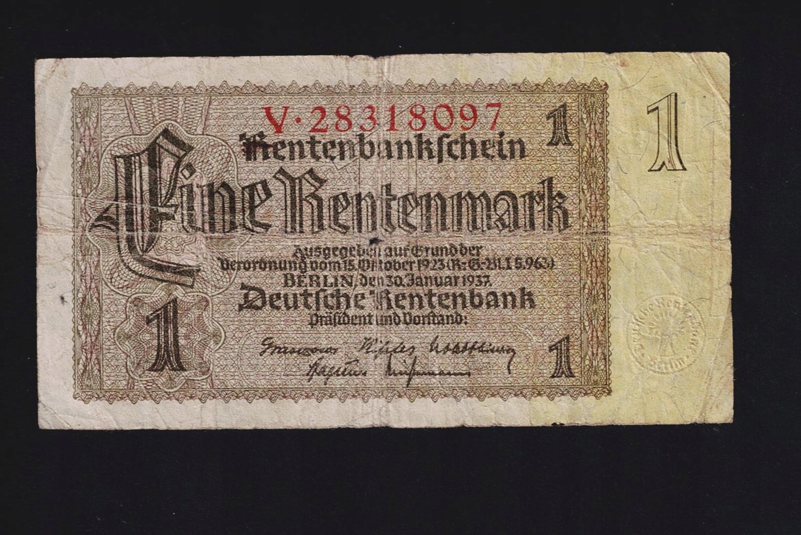 БАНКНОТА НІМЕЧЧИНИ -- 1 марка RENTENMARK -- 1937, серія V