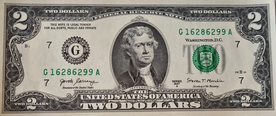 Банкнота номіналом 2 долари 2007 (США) - Bank of Chicago ILLINOIS UNC