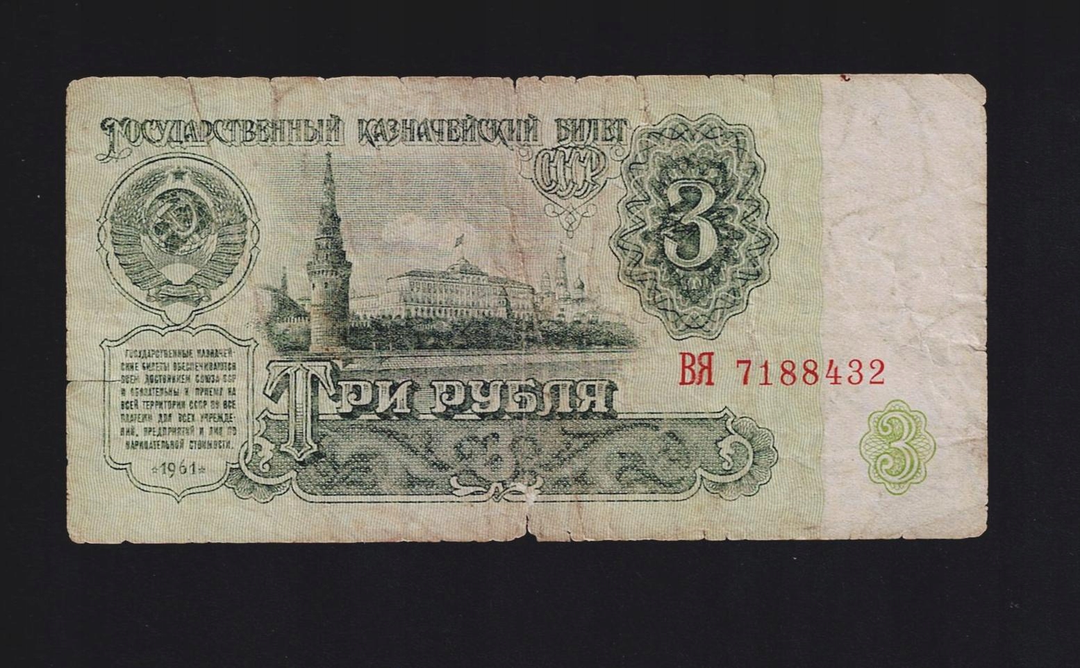 БАНКНОТА РОСІЇ -- 3 рубля -- 1961 р