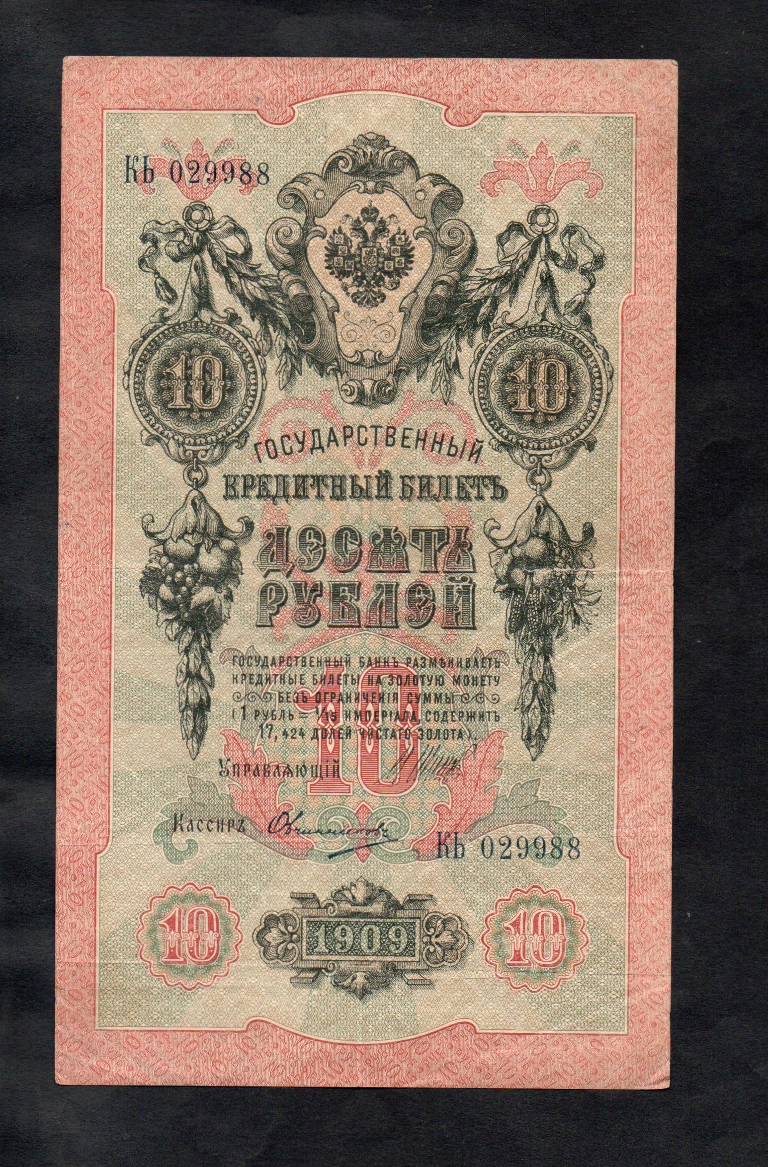 БАНКНОТА РОСІЯ -- 10 рублів 1909 р., КОРАБЕЛЬ - ОВЧІННІКОВ