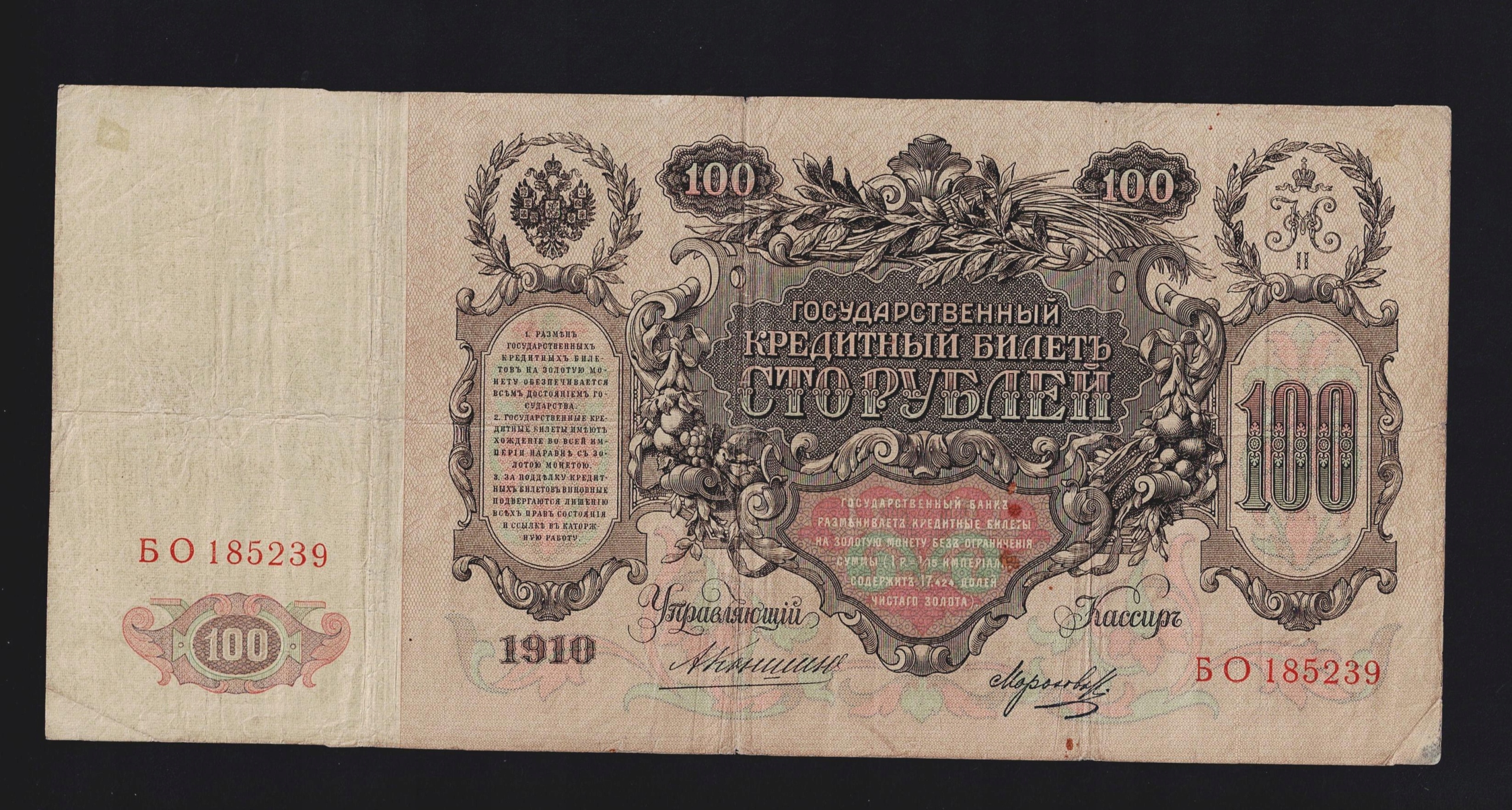 БАНКНОТА РОСІЯ -- 100 Рублів -- 1910 рік, КОНШИН - МОРОЗОВ