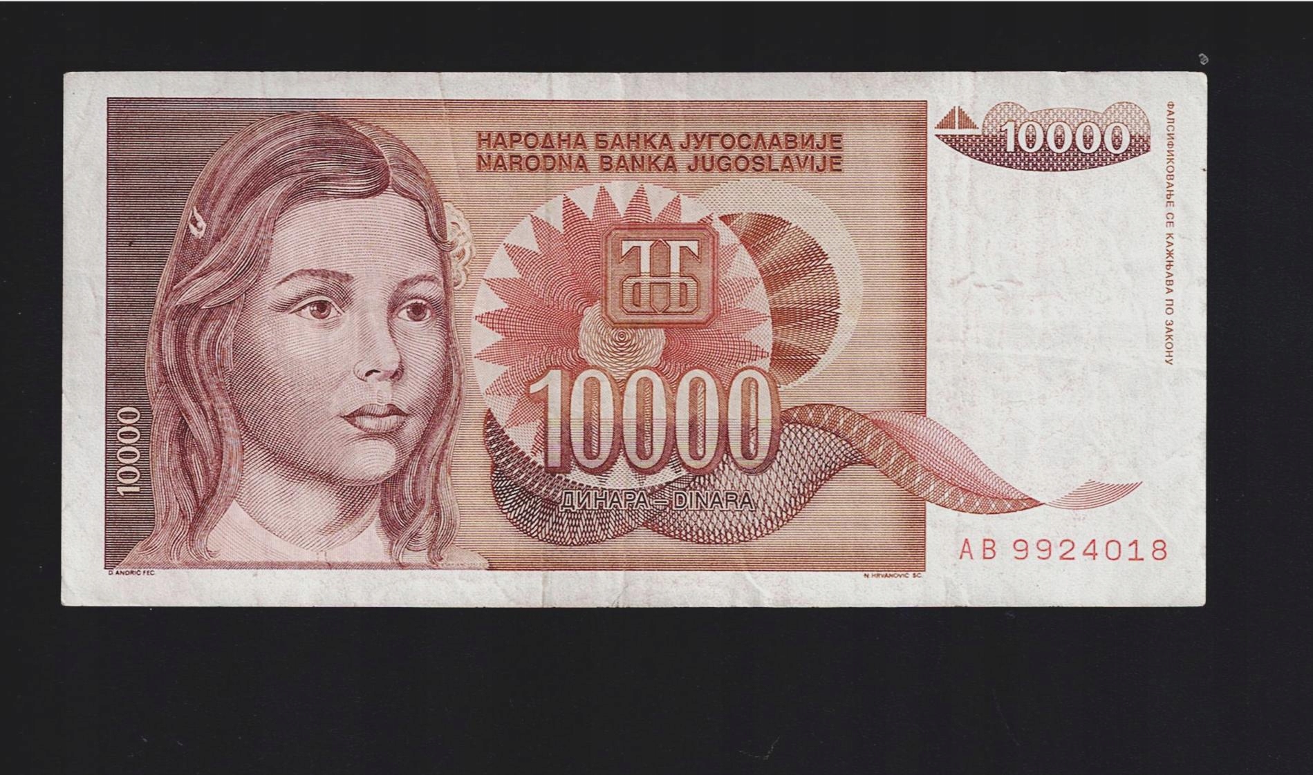 БАНКНОТА ЮГОСЛАВІЇ - 10 000 ДИНАРІВ - 1992