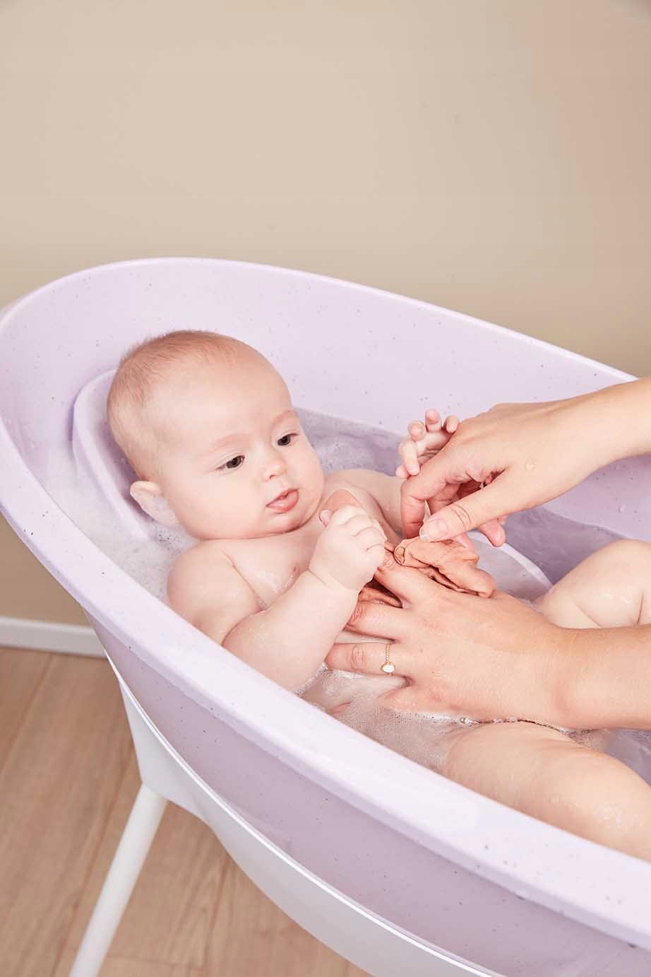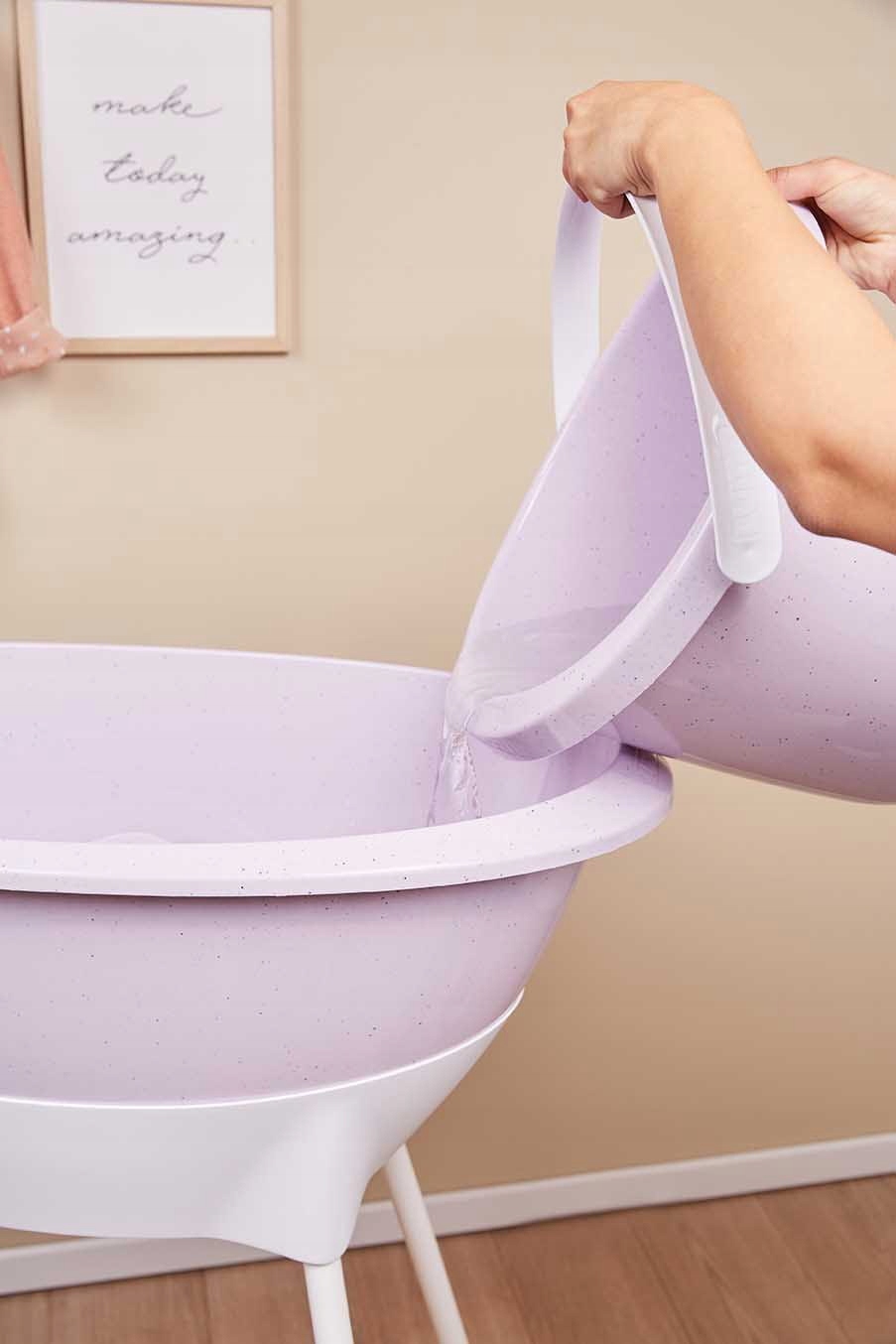 Набір складається з ванночки зі зливною трубою, підставки, відерця для пелюшок, вкладиша для ванночки, термометра для води, манікюрного набору, щітки та гребінця, необхідних для догляду за дитиною.