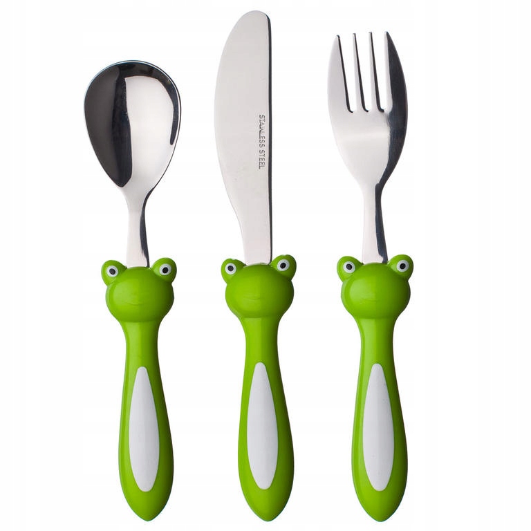 Набір дитячих столових приборів FROG стане улюбленим супутником ваших дітей. Набір із 3 предметів оснащений пластиковою ручкою з мотивом жаби. У набір входить ложка, ніж і виделка. Столові прибори можна мити в посудомийній машині.