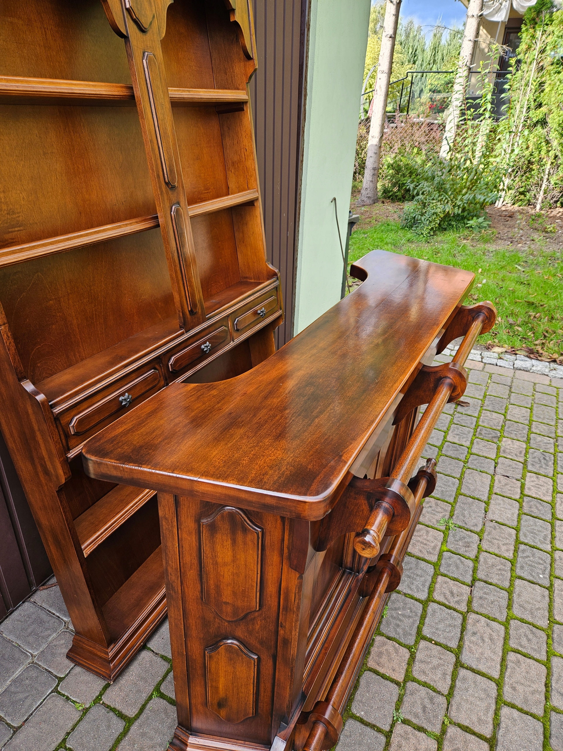 Стильний дерев'яний бар з полицею та великим зручним буфетом. Меблі виконані з масиву, в теплих коричневих тонах. Ціле створює функціонально-декоративний комплект меблів, який може бути привабливим елементом обладнання вітальні чи їдальні.