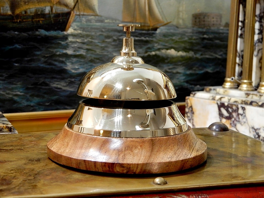 Я запрошую вас придбати гарний готель і дзвінок для прийому гостей. Дзвін виготовлений з блискучої латуні та розміщений на дерев'яній основі.