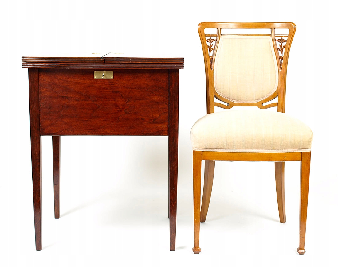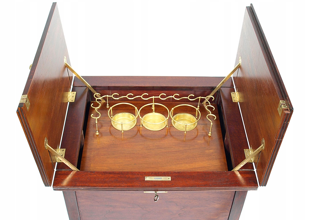4 Верх розділений на дві частини з латунними ручками для отвору. Після натискання обох частин з плоскими рейками з боків, нижня частина піднялася вгору з деканікоками та окулярами. Стабільність скляних елементів відповідає за латунні ручки для окулярів та блюдців з карафними ручками. Весь заблокований ключем. Об'єкт після реконструкції.
