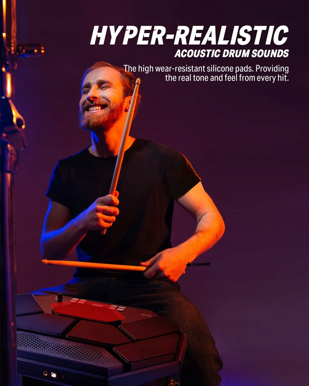Настільна драм-машина має 150 звуків із 50 піснями та 15 наборами ударних, що охоплюють усі музичні стилі. Ви можете насолоджуватися кожною нотою! Ідеальні електричні барабанні установки для дорослих і дітей!