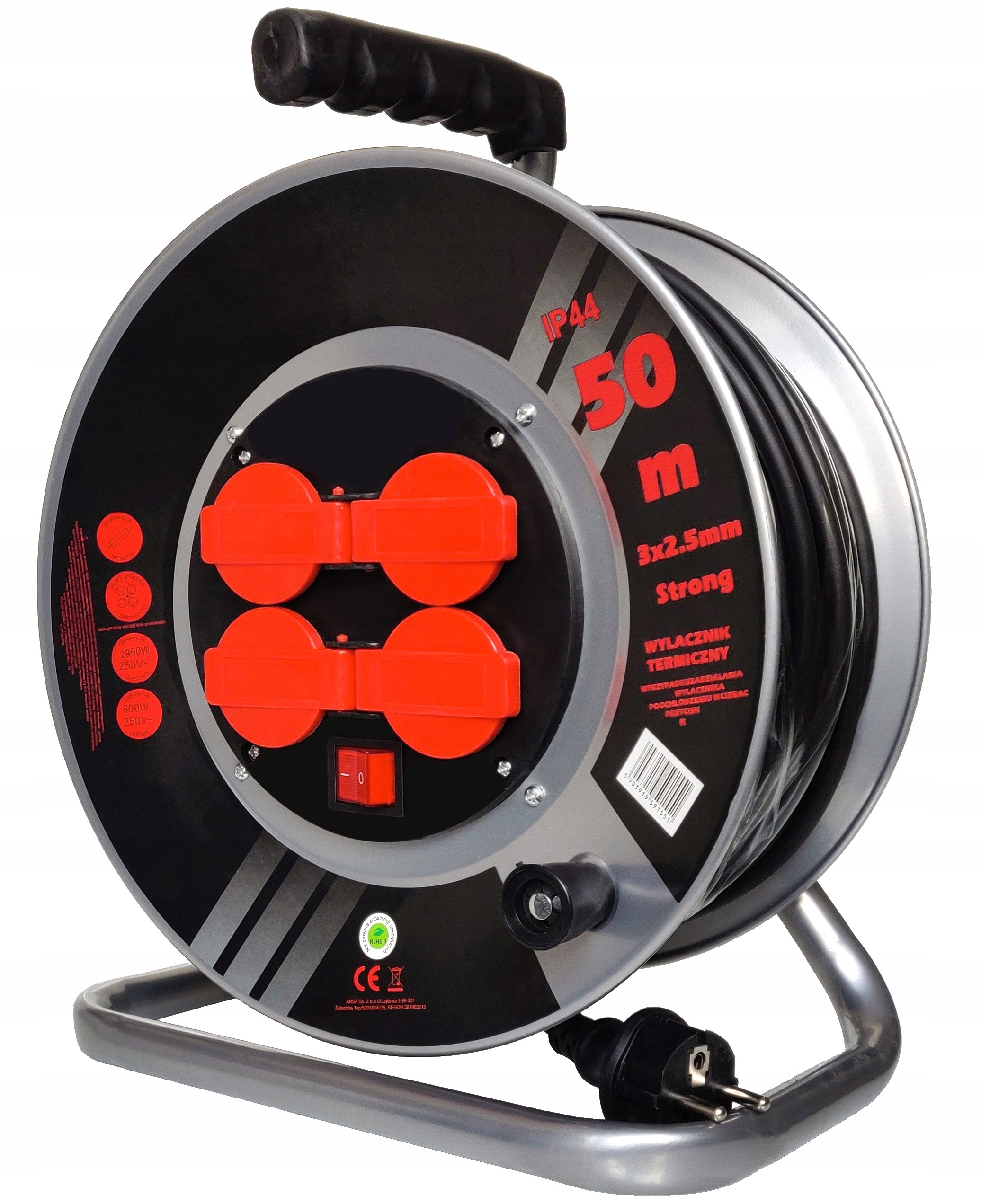 ► Металевий барабан ► 50 метрів ► Перемикач ► 3x2,5 мм кабель ► Термічна захист ► Сокетки ► ступінь захисту
