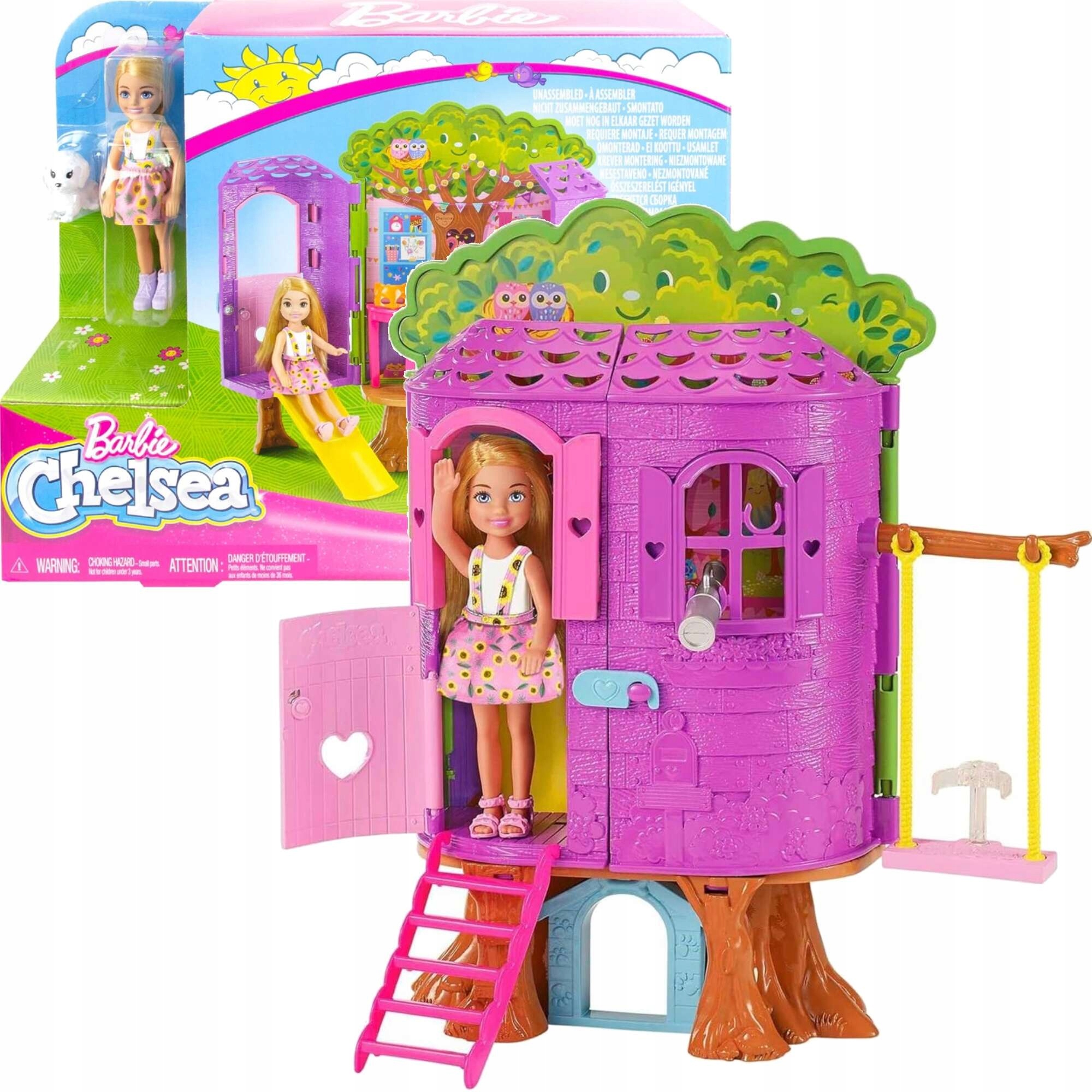 Лялька Челсі, одягнений у барвисту сукню з квітковим візерунком і світло -фіолетовим взуттям, готовий до цілого дня веселощів. Він може піднятися по сходах , ковзати вниз по слайду , гойдатися до гойдалки або милуватися зірками телескопом . Набір також включає смішні маски для тварин та аксесуари для тематичної забави.