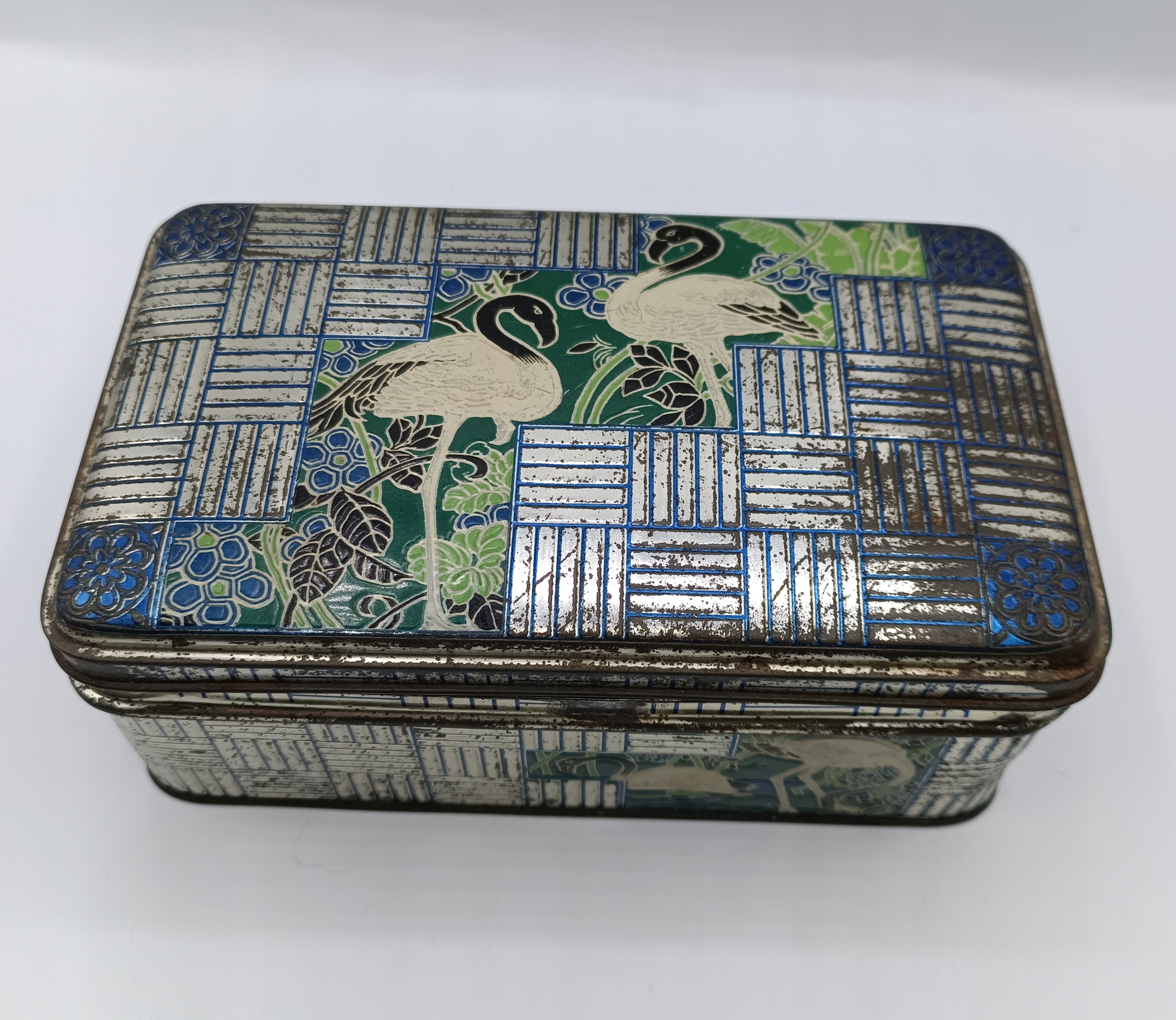 bardzo stara puszka z metalu szkatuła - ptaki - czaple - 20 cm