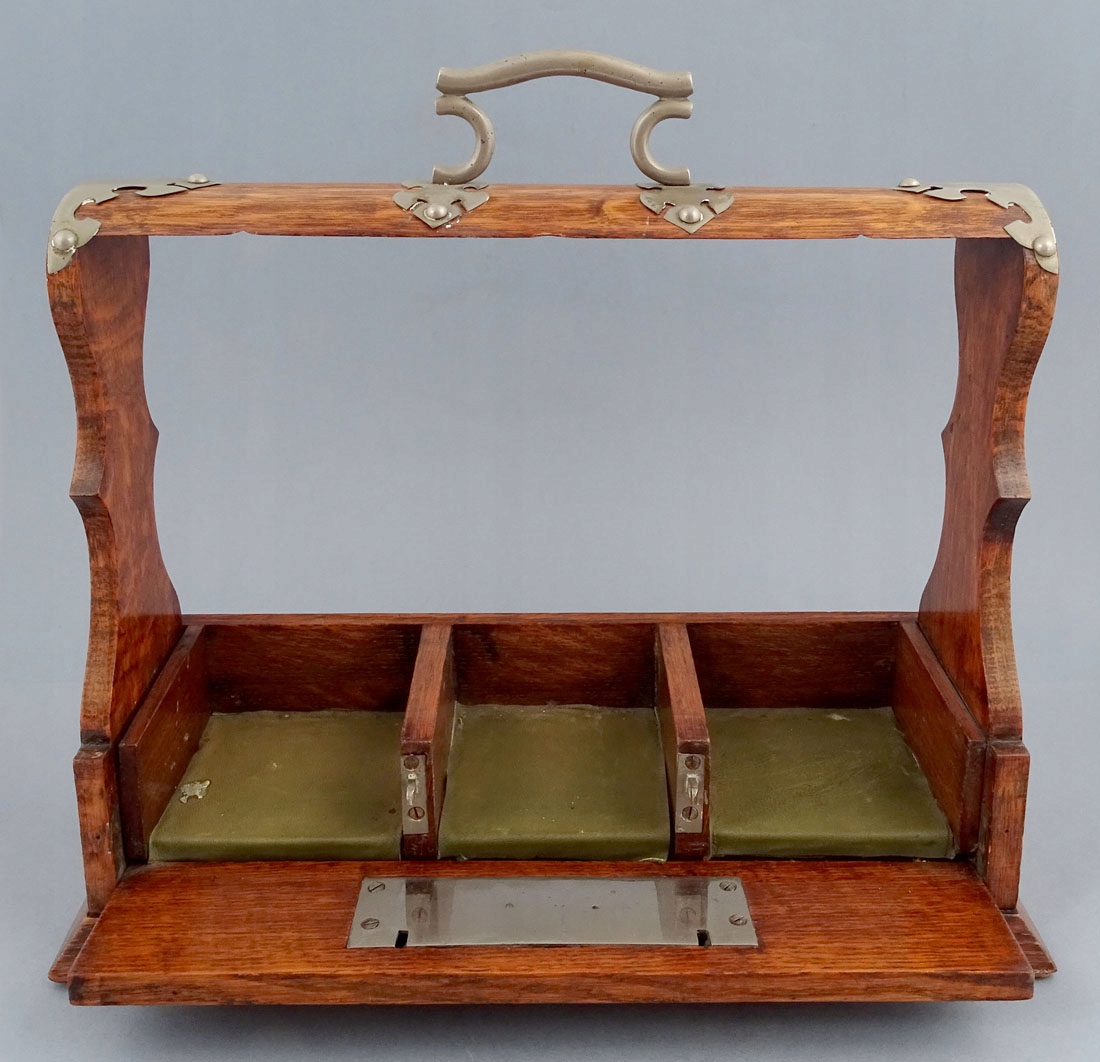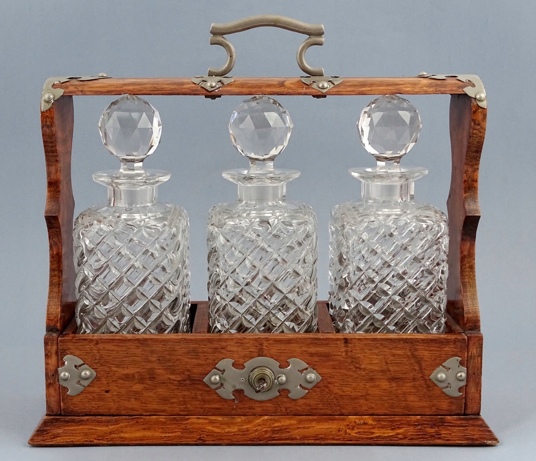 з трьома прямокутними кришталевими графинами, з пробками, захованими під дерев'яним дахом. Графини, вирізані по діагоналі, з широкими носиками та полірованими пробками у формі кулі. Ящик дерев'яний, закритий спереду дошкою на замок і ключ. Зверху є латунна ручка для перенесення.