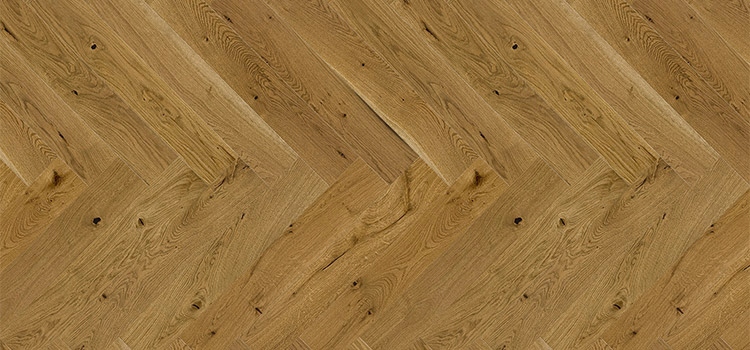 Тепла коричнева дубова підлога з сильним акцентом особливості деревини. Зернистий малюнок було підсилено щіткою, а 4-стороння мікрофібра ще більше витончила підлогу. Покрита матовим лаком.